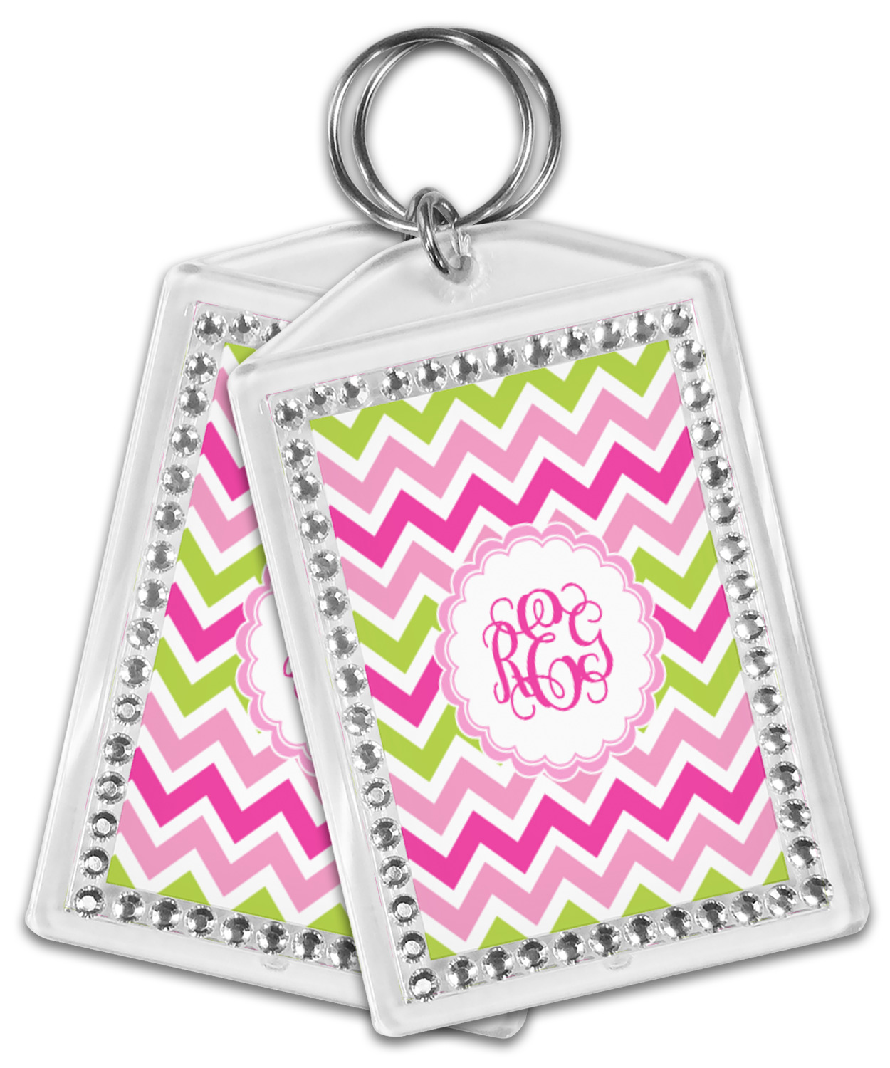 Our personalized keychains have a bold, rectangular shape, outlined by a series of shimmering rhinestones. A metal, split keyring is included with your purchase, and an additional metal hoop allows for attachment of the keychain to the split ring. This unique keychain measures at about 3.75 by 2.5 inches. We print your customized design(s) across both the back and front of this keychain.