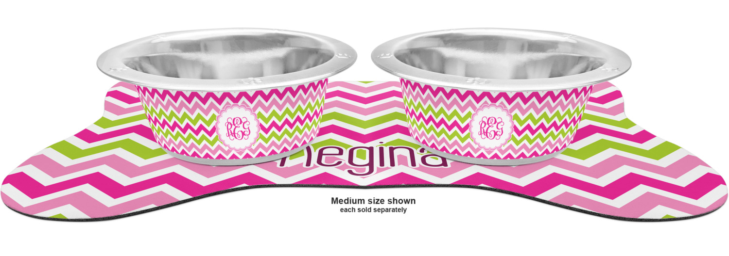 The top of this mat displays your custom design, as it is printed on polyester. To prevent slippage, the underside of the mat is made of rubber. We offer a small dog food mat, suitable for smaller dogs and a large dog food mat for bigger breeds. The small dog food mat is approximately 19 by 13 inches, while the large dog feeding mat measures at approximately 26.75 by 18 inches. Both personalized mats are ideally sized to fit two dog bowls.