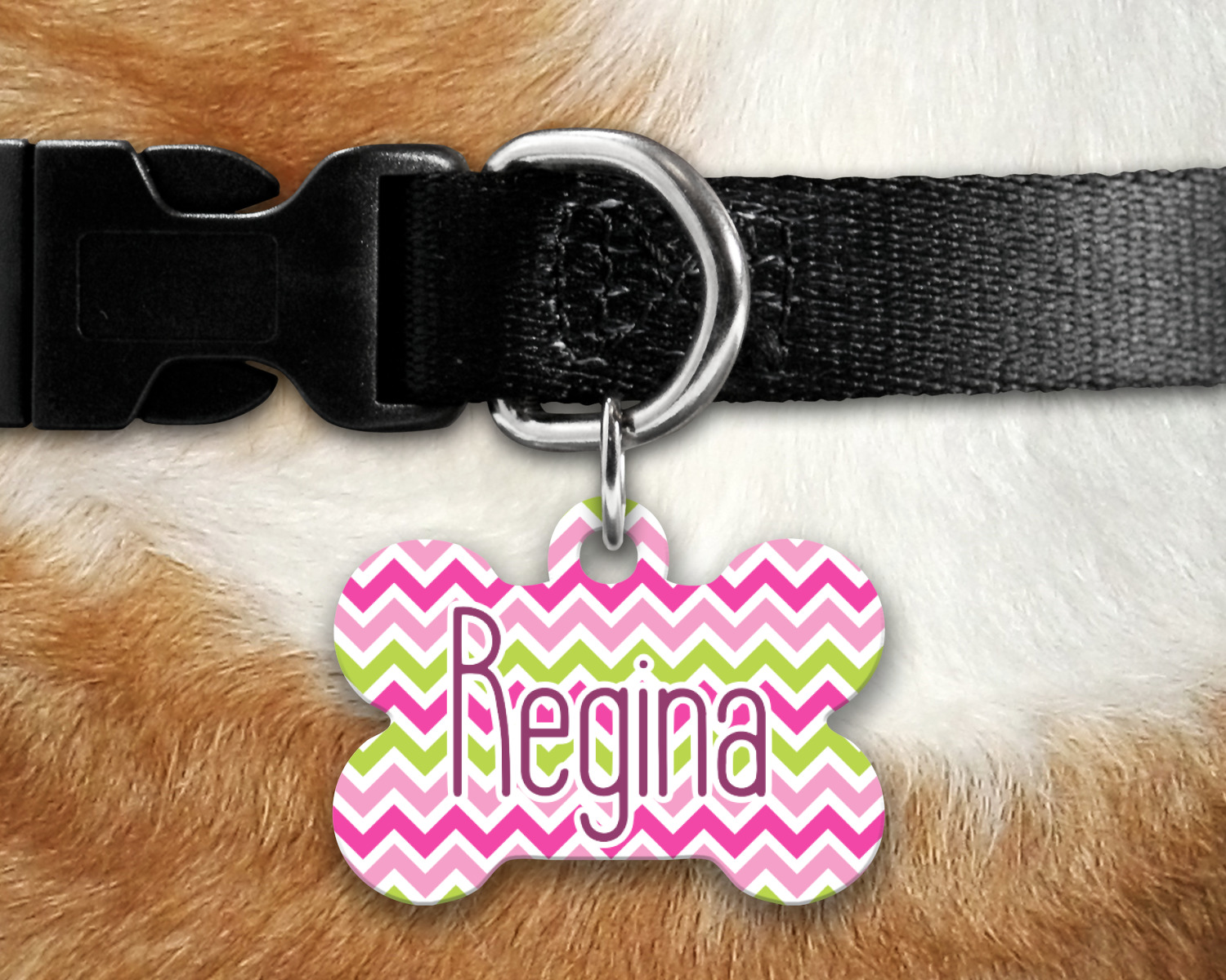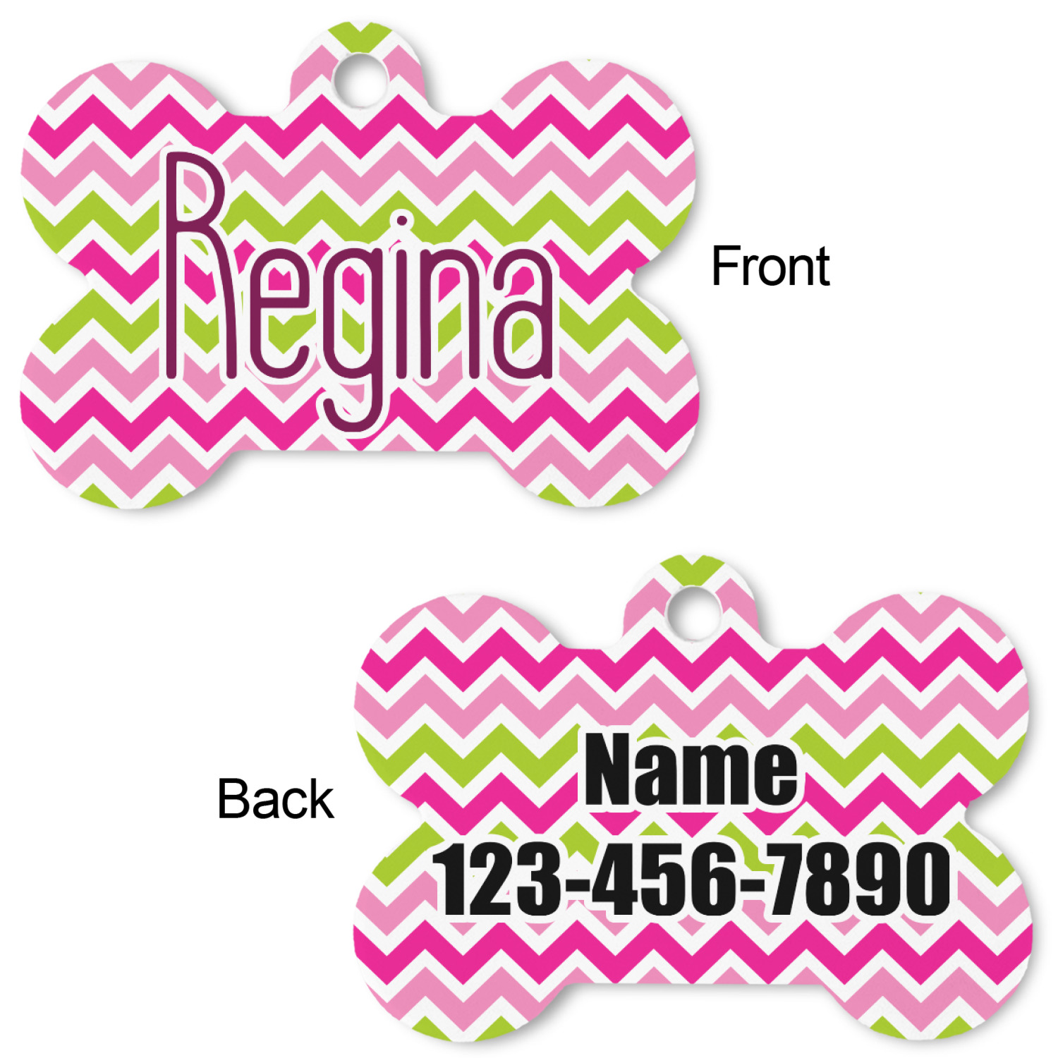 Our default design templates print your dog's personalization on the front and your contact information on the back; however everything is customizable, so you customize the patterns, the colors, the personalization, the contact information etc.
