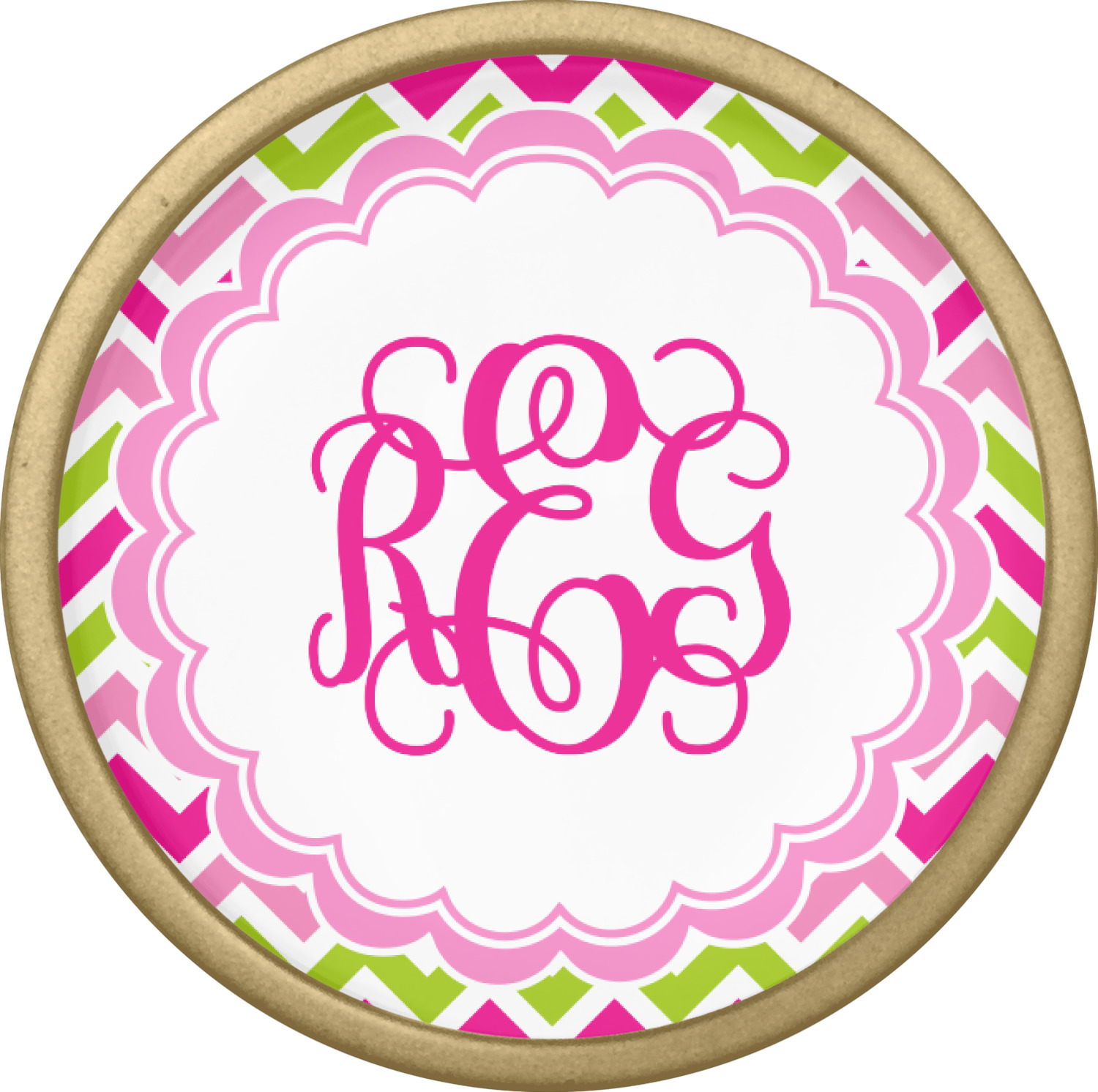 Looking for a girly girl design. This pink and green chevron print with a scalloped label and an interlocking monogram is as girly as it gets. We have created this chevron pattern in lime green, orchid pink and hot pink. For all of us girly girls and princesses, this is our design choice!