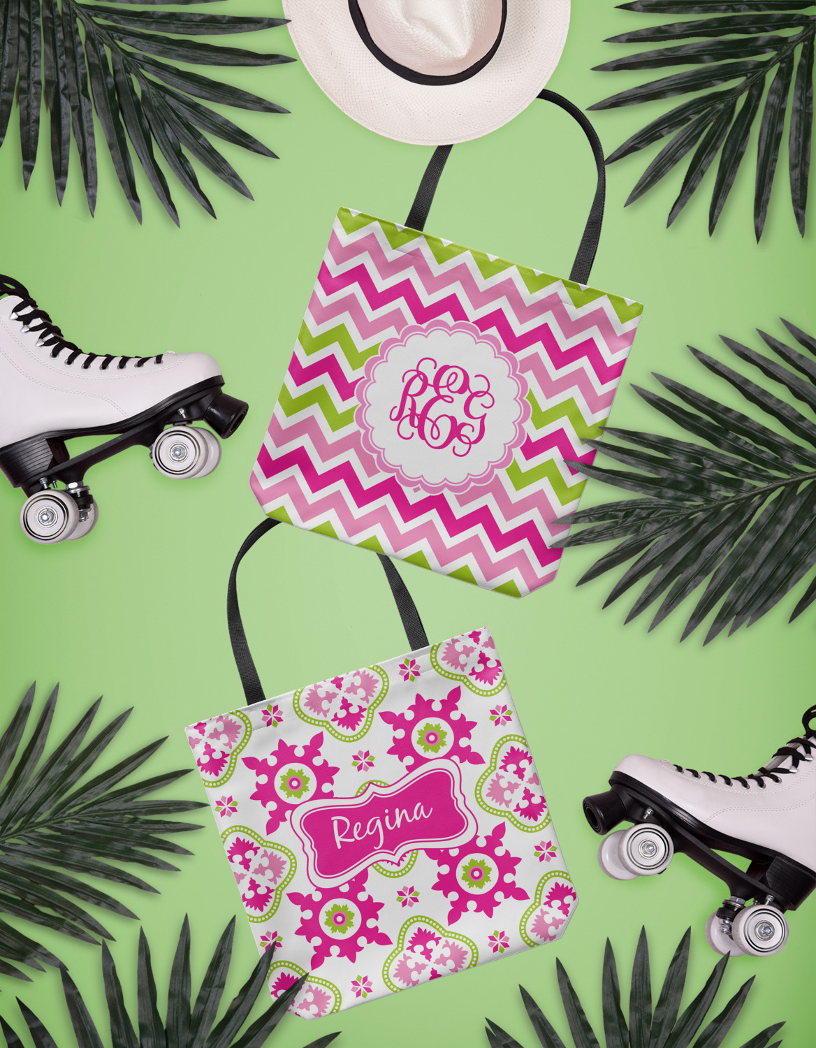Our all purpose Canvas Totes bags are available in 3 sizes and in hundreds of different designs with many different prints & patterns, which are available in many different colors. You can customize the labels, the ribbons, the personalization styles and of course the fonts.