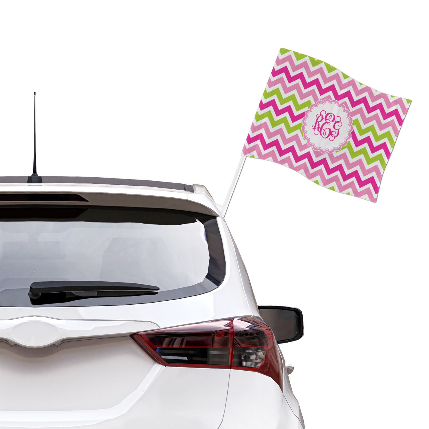 Our personalized flags are made from a durable, yet lightweight cloth that will proudly bear your logo or design of choice, while withstanding the outside elements. We have two size options - 8" x 11" and 11" x 15". Both come with a flag pole which includes a clip that secures the pole to the side window, whether it is rolled up or down. The flags are printed on both sides to display your design from all directions.