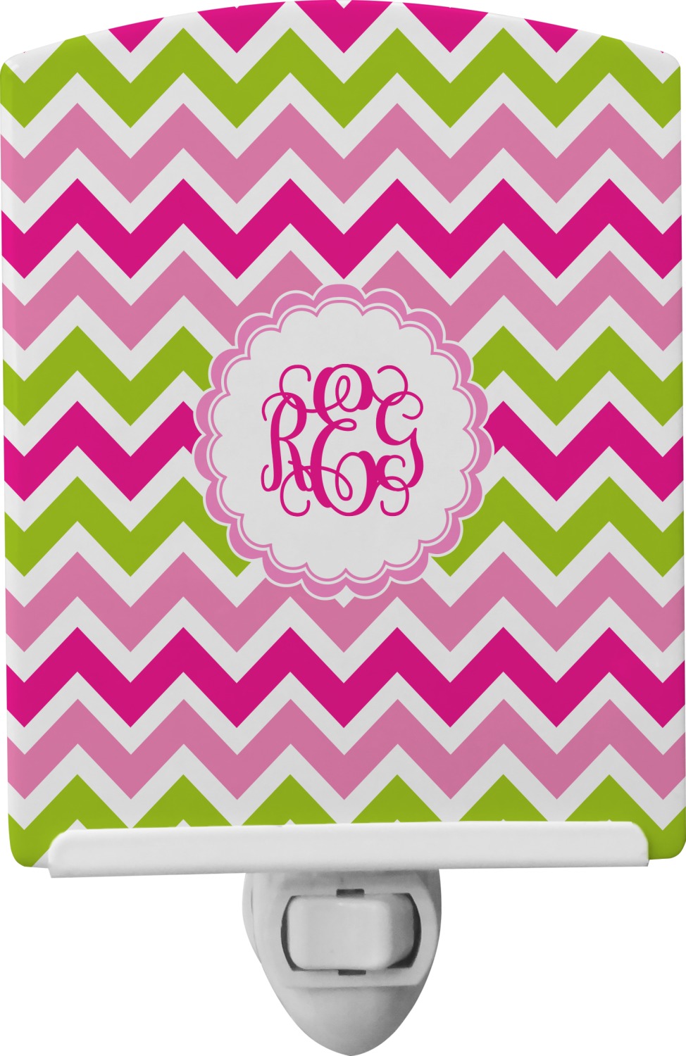 Looking for a girly girl design. This pink and green chevron print with a scalloped label and an interlocking monogram is as girly as it gets. We have created this chevron pattern in lime green, orchid pink and hot pink. For all of us girly girls and princesses, this is our design choice!
