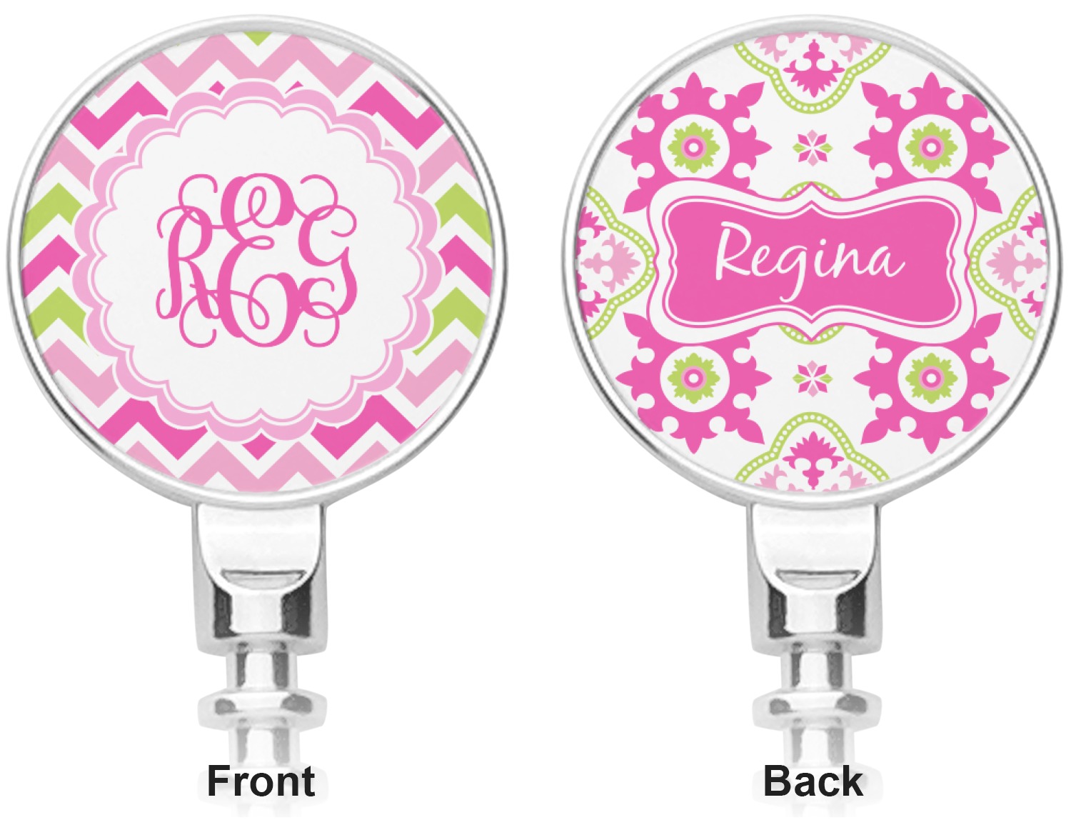 Looking for a girly girl design. This pink and green chevron print with a scalloped label and an interlocking monogram is as girly as it gets. We have created this chevron pattern in lime green, orchid pink and hot pink. For all of us girly girls and princesses, this is our design choice!