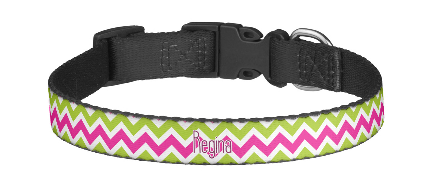 This sturdy collar, made from a durable nylon weave, will outlive your dog's episodes of excited tugging and pulling. Courtesy of its thick plastic buckle and adjuster, this collar is adjustable and accommodating of any dog. Structurally, the collar is a single piece of nylon weave that is sewn together, and features a solid metal loop where you can attach a leash or dog tag. We print and display your dog's name and pattern across the middle of the personalized dog collar.