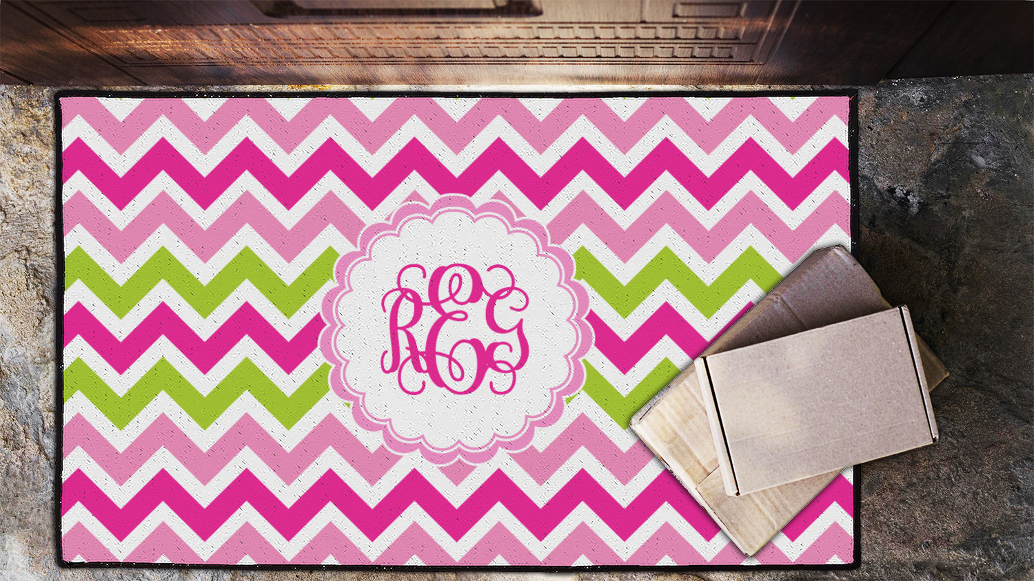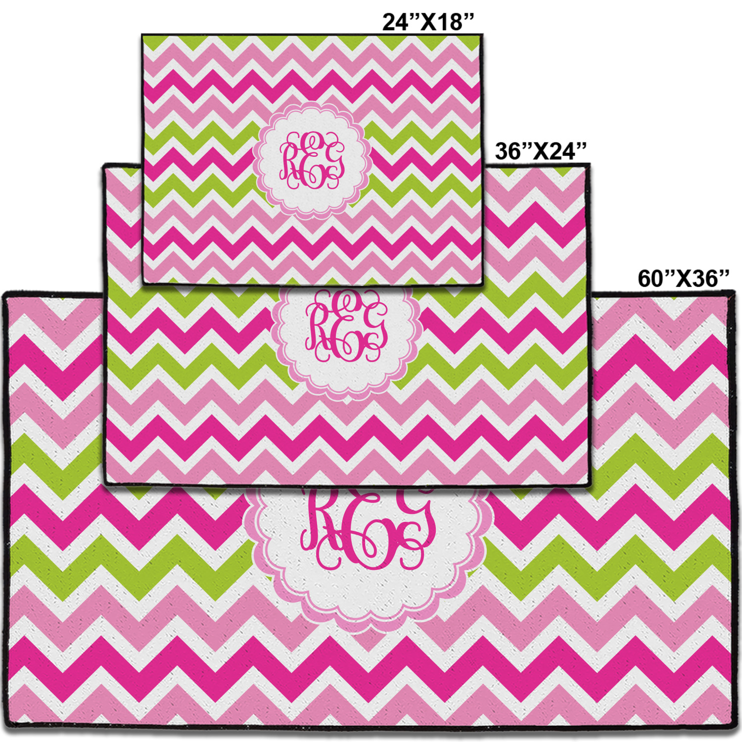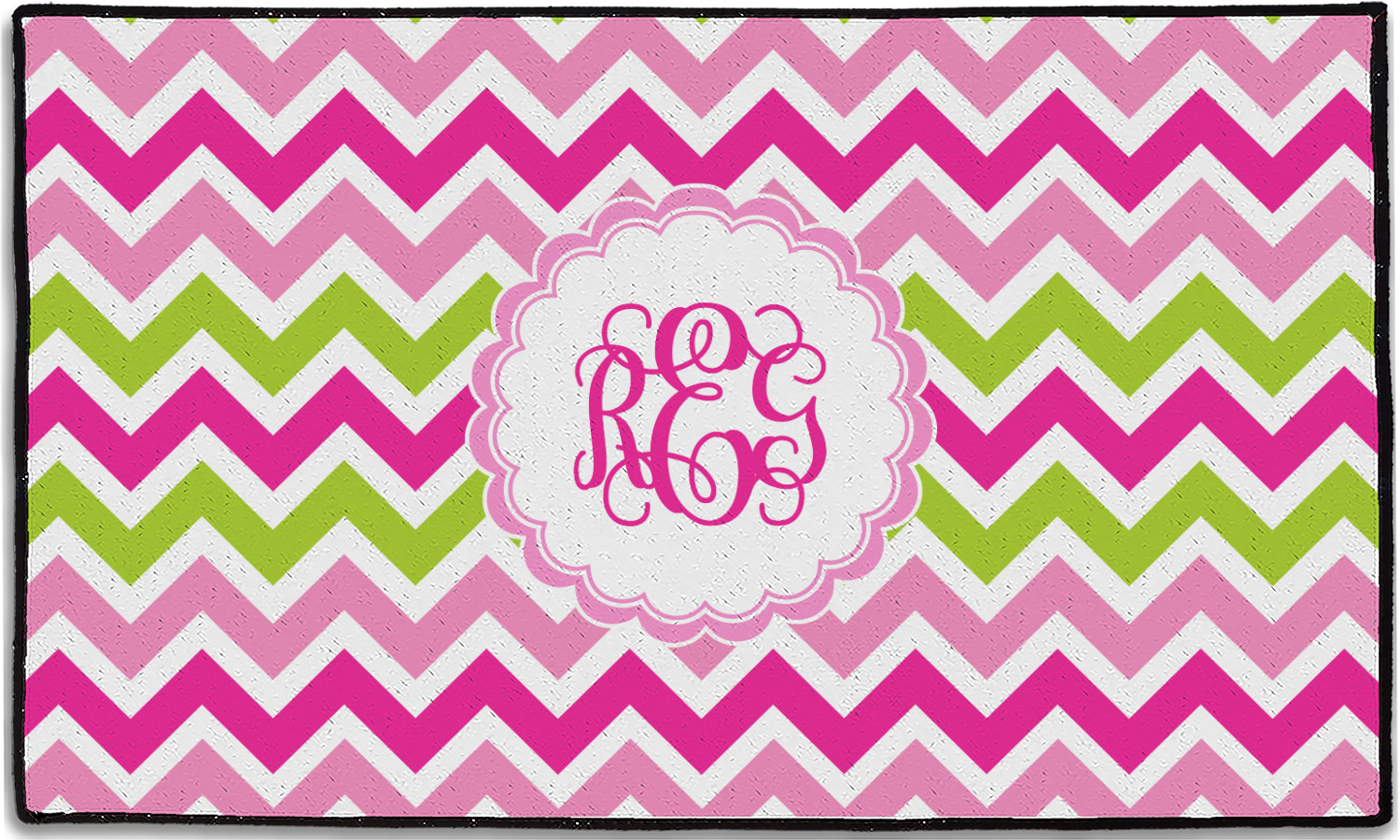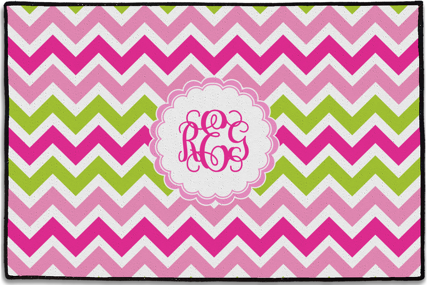 Looking for a girly girl design. This pink and green chevron print with a scalloped label and an interlocking monogram is as girly as it gets. We have created this chevron pattern in lime green, orchid pink and hot pink. For all of us girly girls and princesses, this is our design choice!