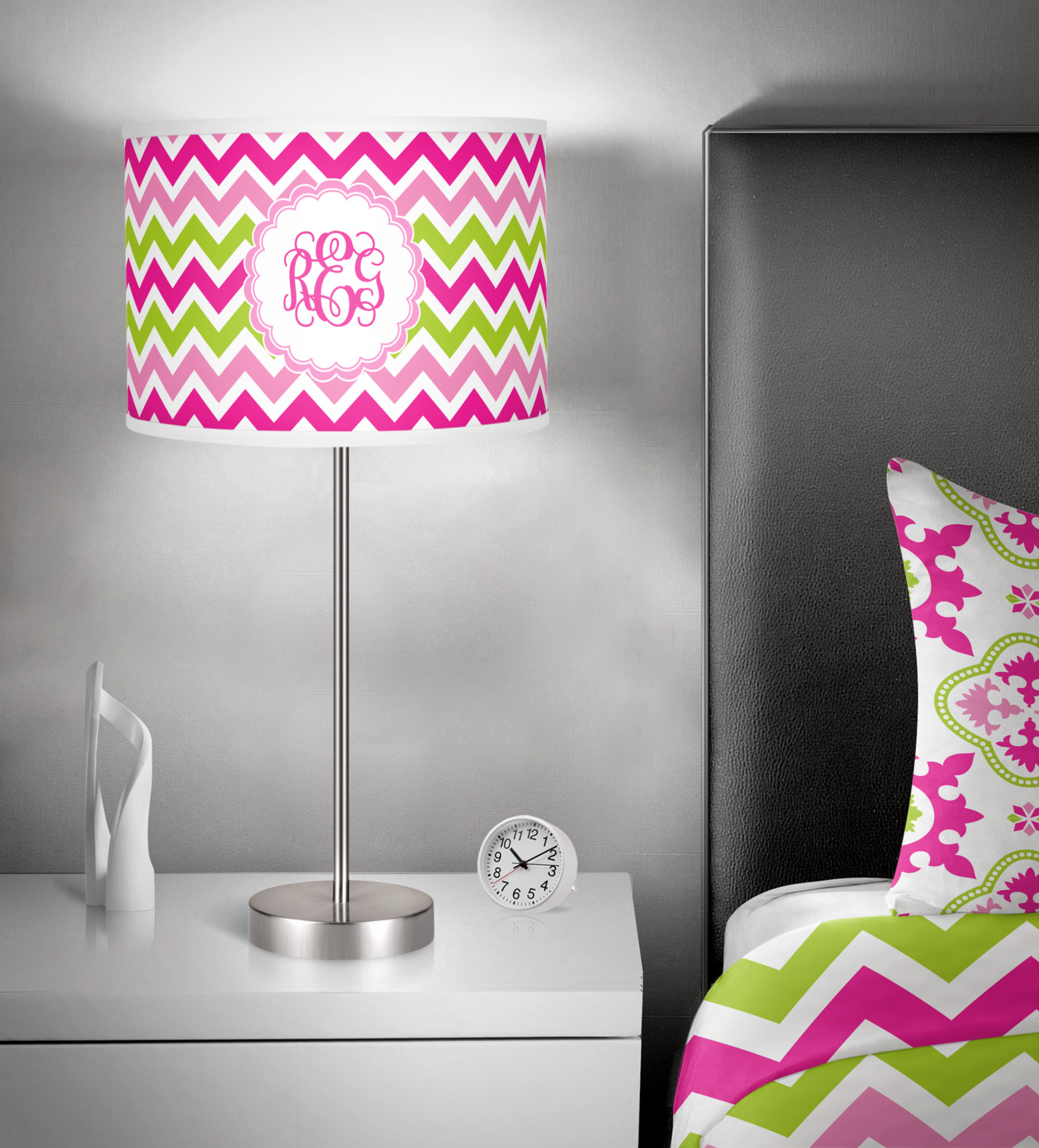 Looking for a girly girl design. This pink and green chevron print with a scalloped label and an interlocking monogram is as girly as it gets. We have created this chevron pattern in lime green, orchid pink and hot pink. For all of us girly girls and princesses, this is our design choice!