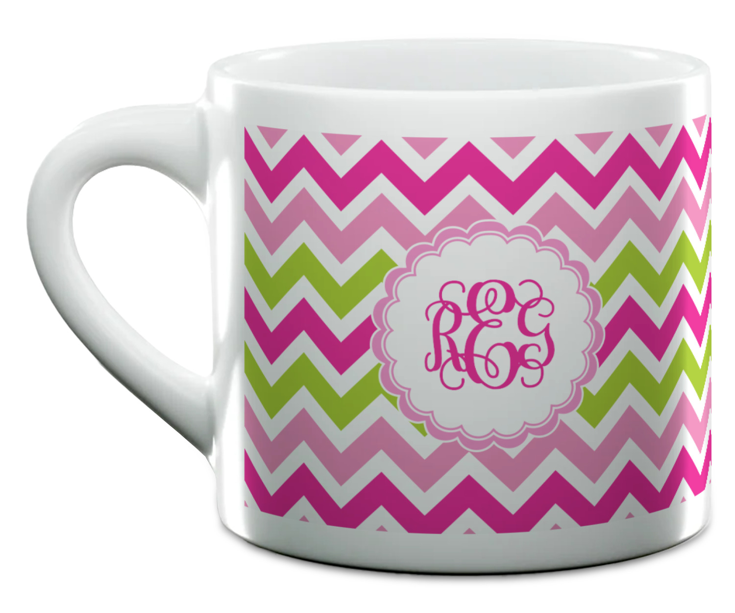 Each of our espresso mugs is a ceramic material sure to keep your drink warm. Personalize one cup for yourself, or order a set of 4! Its the perfect little gift for any coffee lover! We carry two sizes for you to personalize - 3 oz. (approx. 3.25" x 2.325" x 2.625") or 6 oz. (approx. 4" x 2.9" x 2.9"). Our 3 oz. mug is perfect for that single shot espresso while our 6 oz. mug can be your next favorite cappuccino cup holding two shots of espresso!