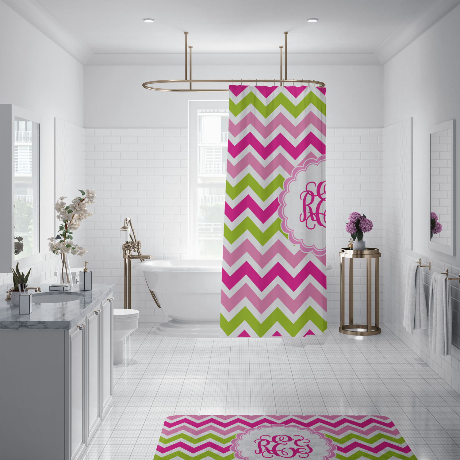 Looking for a girly girl design. This pink and green chevron print with a scalloped label and an interlocking monogram is as girly as it gets. We have created this chevron pattern in lime green, orchid pink and hot pink. For all of us girly girls and princesses, this is our design choice!