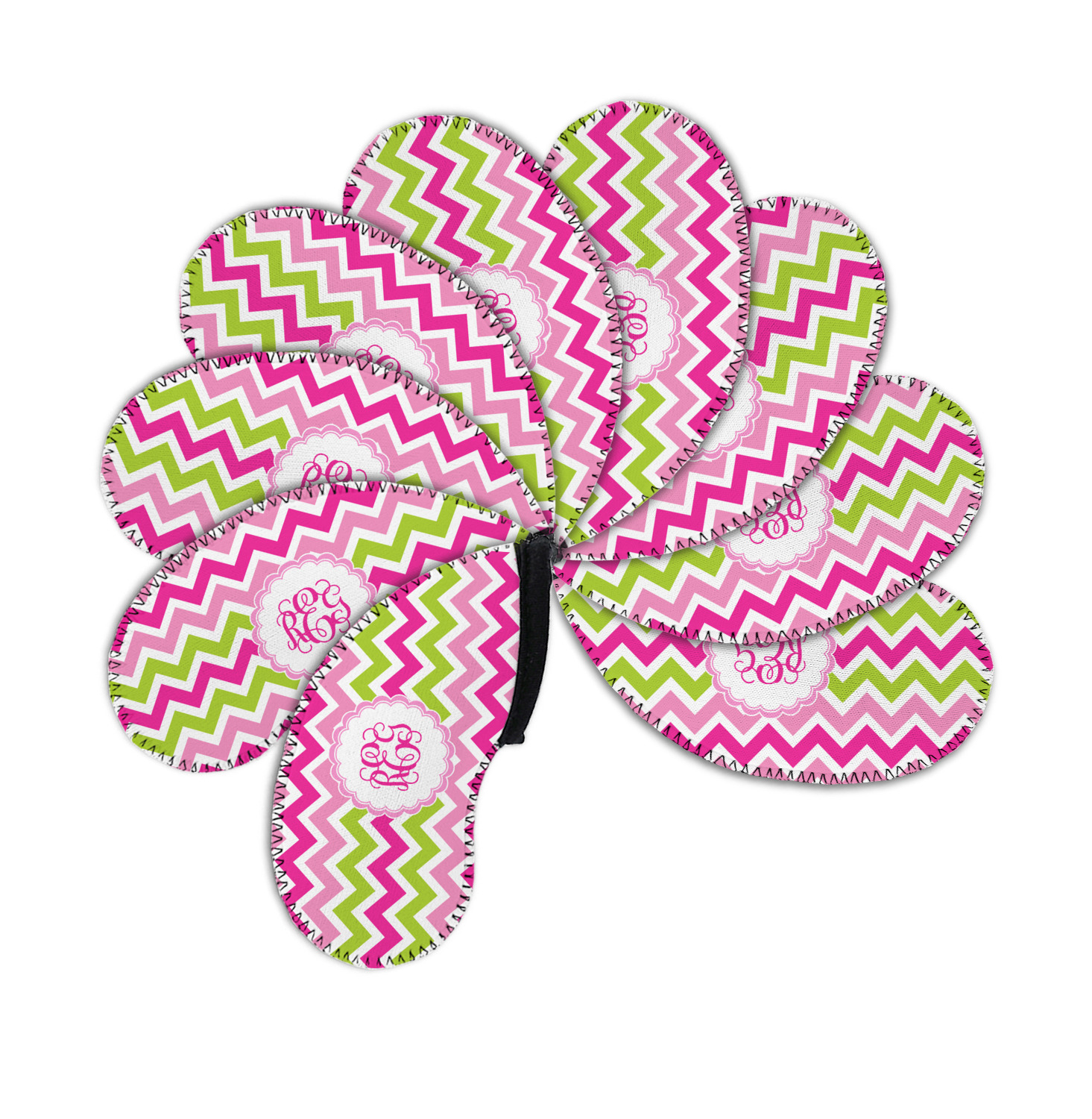 Looking for a girly girl design. This pink and green chevron print with a scalloped label and an interlocking monogram is as girly as it gets. We have created this chevron pattern in lime green, orchid pink and hot pink. For all of us girly girls and princesses, this is our design choice!