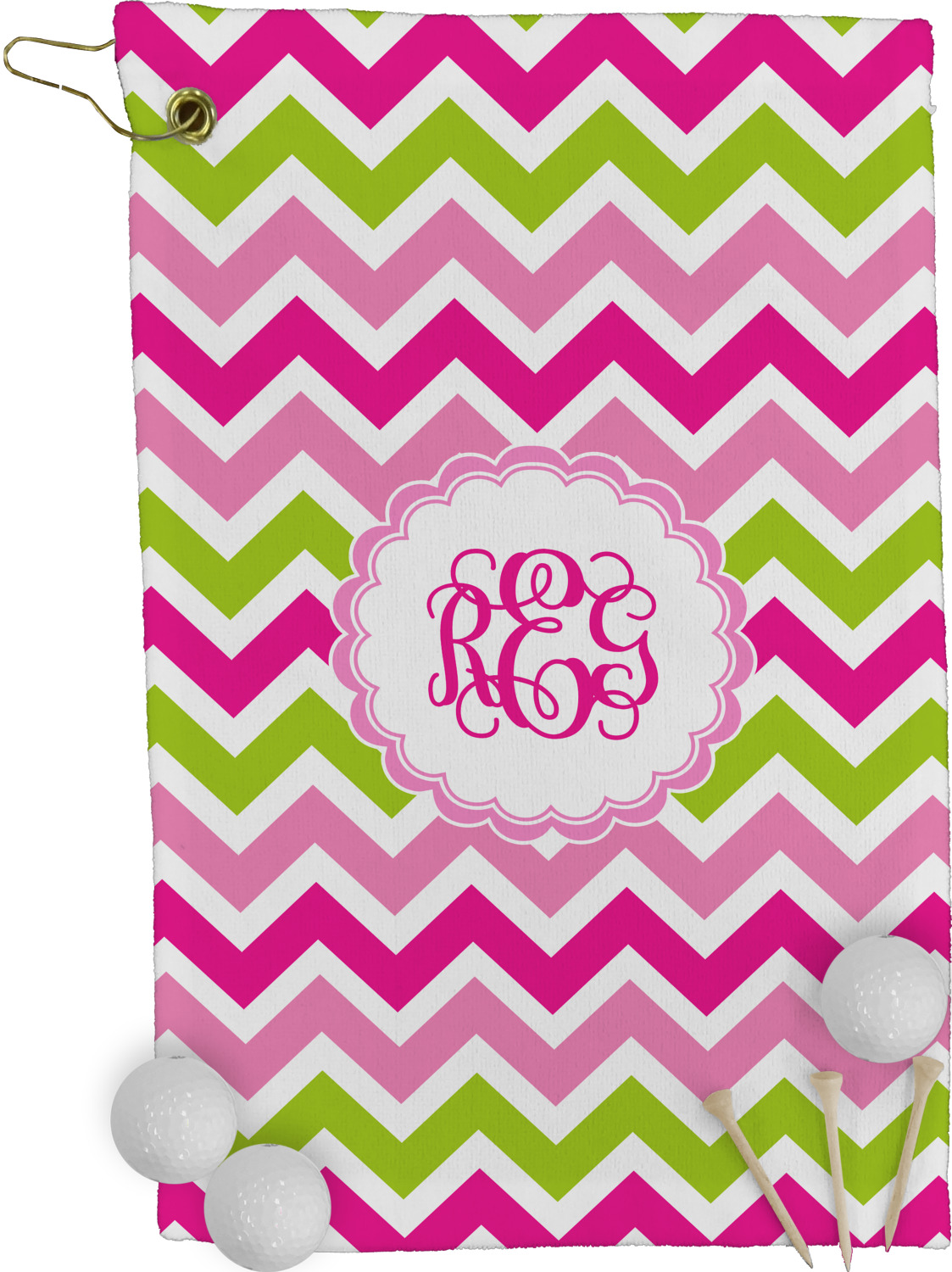 The towel is fully printed / patterned on the front polyester side; and is white on terrycloth cotton backside. The towel has grommet and a pear spring clip in the top left corner. Our golf towels are available in 100s of different prints and patterns.