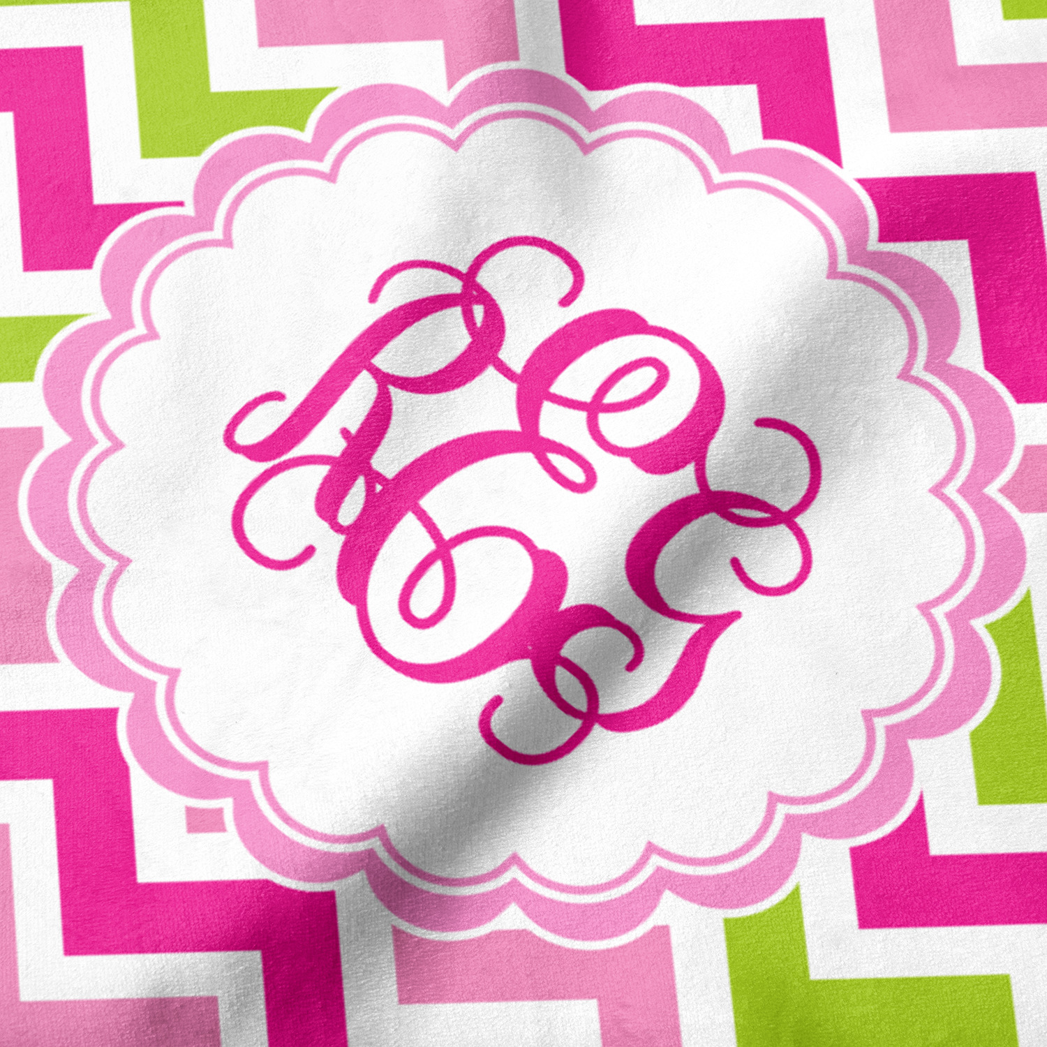 Looking for a girly girl design. This pink and green chevron print with a scalloped label and an interlocking monogram is as girly as it gets. We have created this chevron pattern in lime green, orchid pink and hot pink. For all of us girly girls and princesses, this is our design choice!