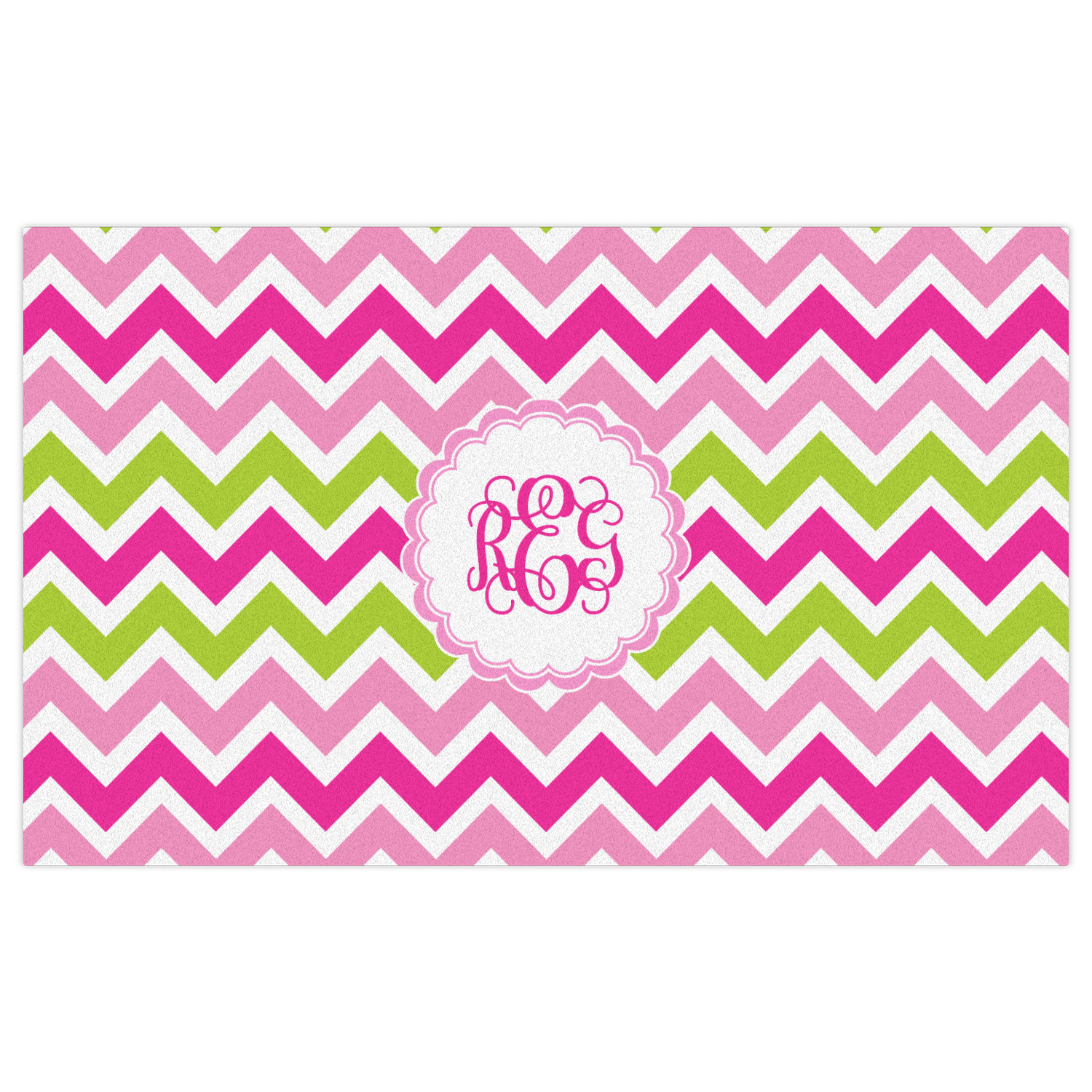 Looking for a girly girl design. This pink and green chevron print with a scalloped label and an interlocking monogram is as girly as it gets. We have created this chevron pattern in lime green, orchid pink and hot pink. For all of us girly girls and princesses, this is our design choice!