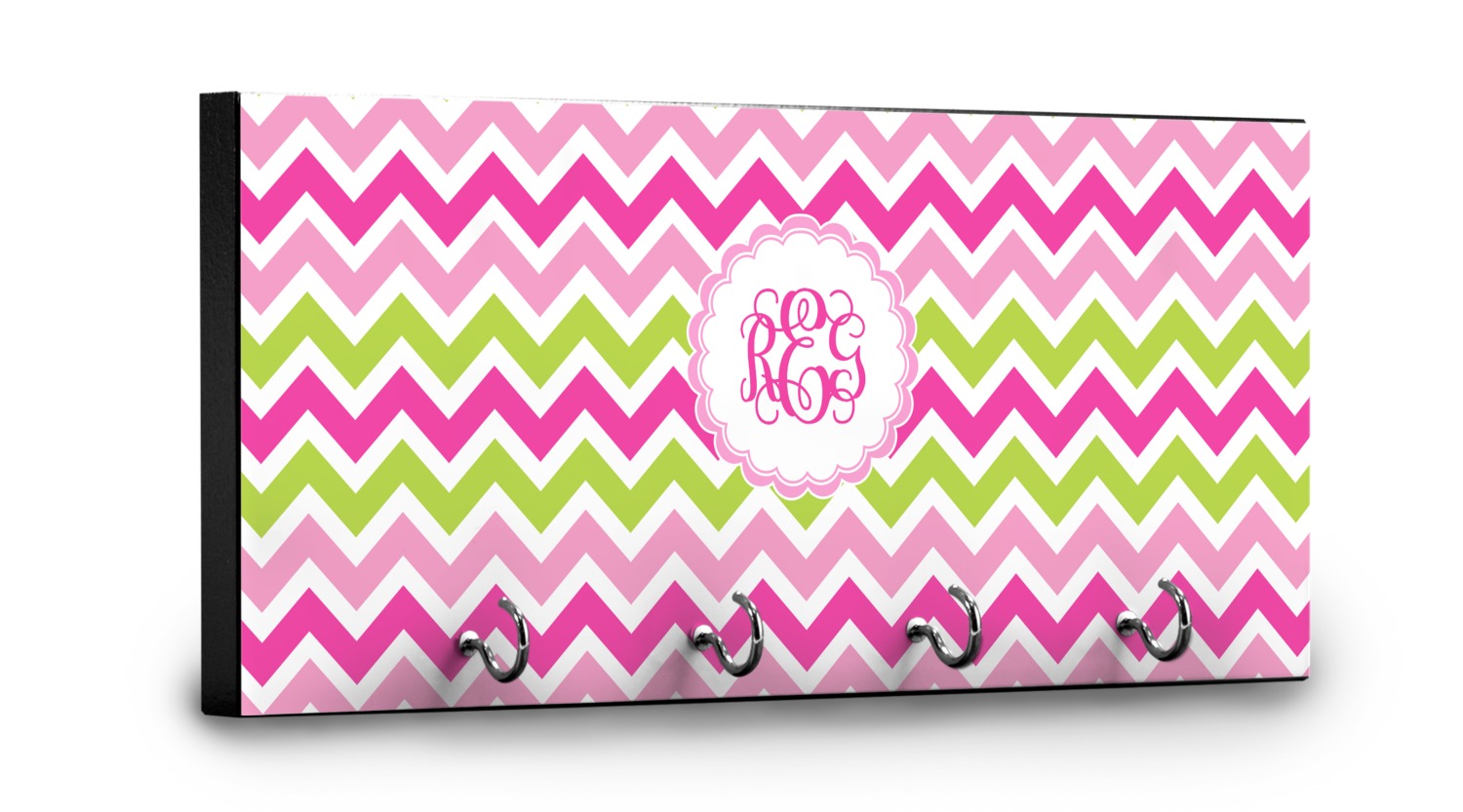 Looking for a girly girl design. This pink and green chevron print with a scalloped label and an interlocking monogram is as girly as it gets. We have created this chevron pattern in lime green, orchid pink and hot pink. For all of us girly girls and princesses, this is our design choice!