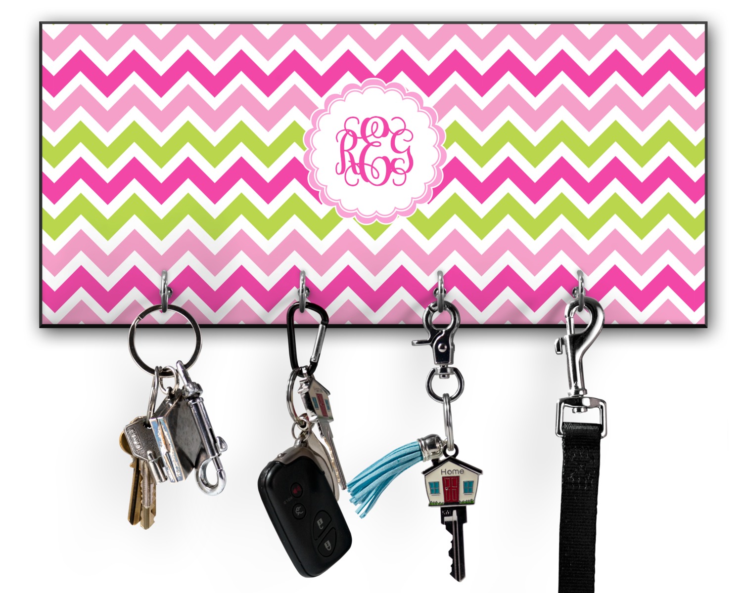 This 11" x 5" key hanger is made of sturdy wood and has four metal hooks lining the bottom. This is the perfect size for a family with several drivers. Not only can you hang keys on it though, but pet leashes and other small items. The board is black on the sides and back and is printed with the design of your choice on the front.