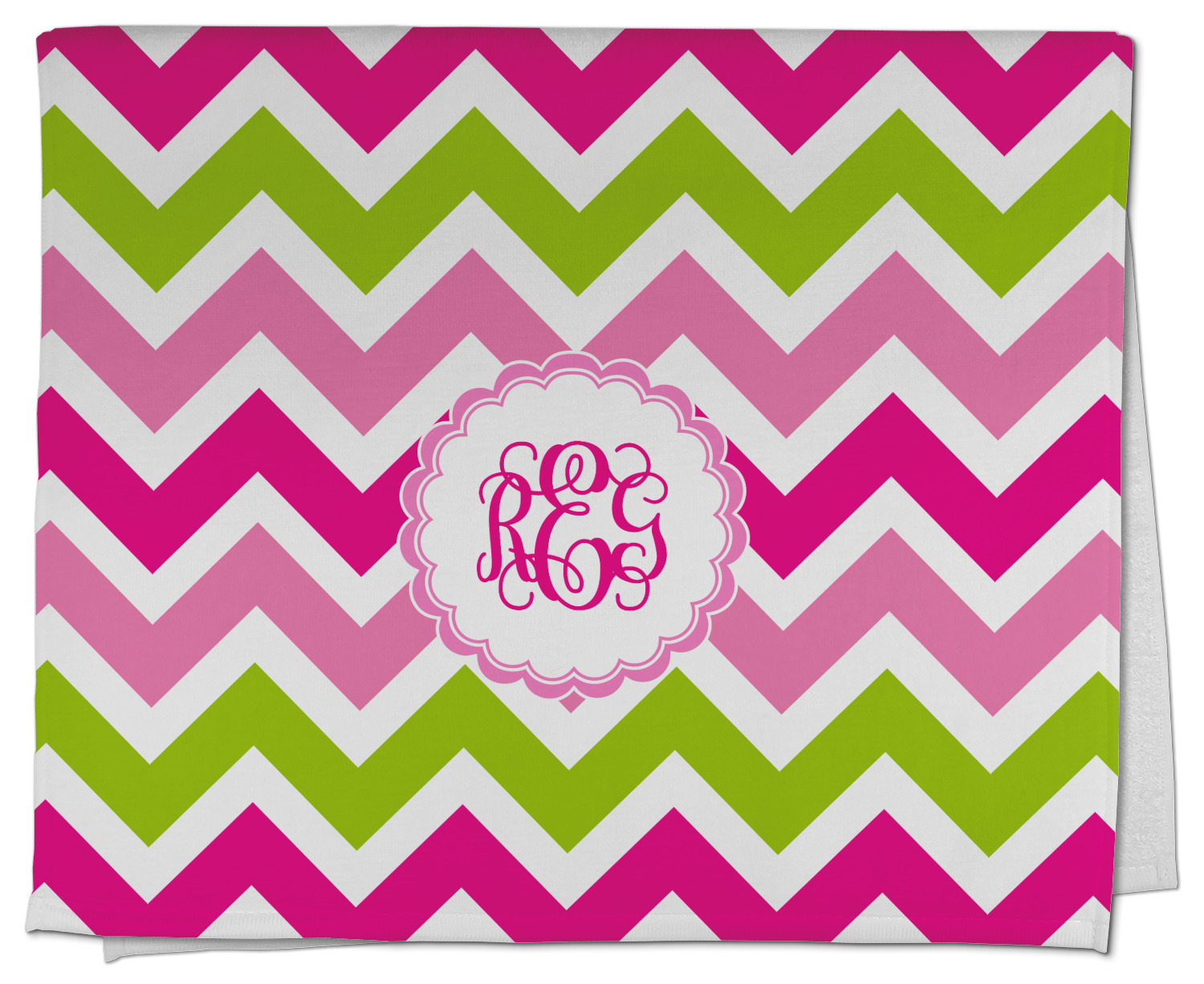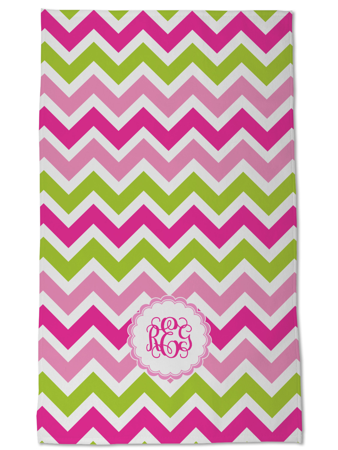 Looking for a girly girl design. This pink and green chevron print with a scalloped label and an interlocking monogram is as girly as it gets. We have created this chevron pattern in lime green, orchid pink and hot pink. For all of us girly girls and princesses, this is our design choice!
