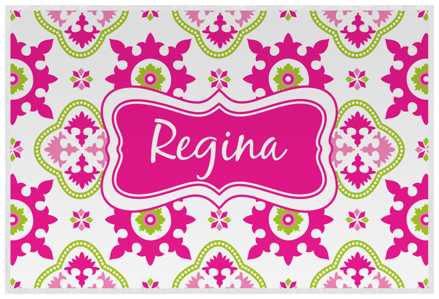 Looking for a girly girl design. This pink and green chevron print with a scalloped label and an interlocking monogram is as girly as it gets. We have created this chevron pattern in lime green, orchid pink and hot pink. For all of us girly girls and princesses, this is our design choice!
