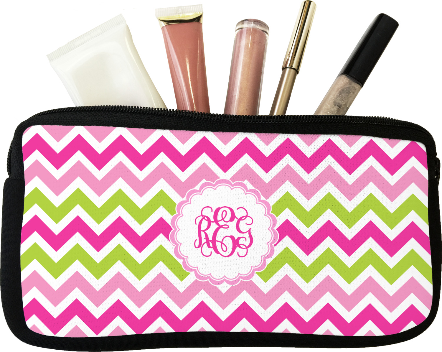 Our personalized makeup bags are available in many different designs, patterns and colors - so you are sure to find one that will love. They are made of neoprene (same material as wet-suits) and thus are water resistant, so spillages in your makeup bag will not end up all over you purse. They are customized on one side and are black on the other side and the zipper is black as well.