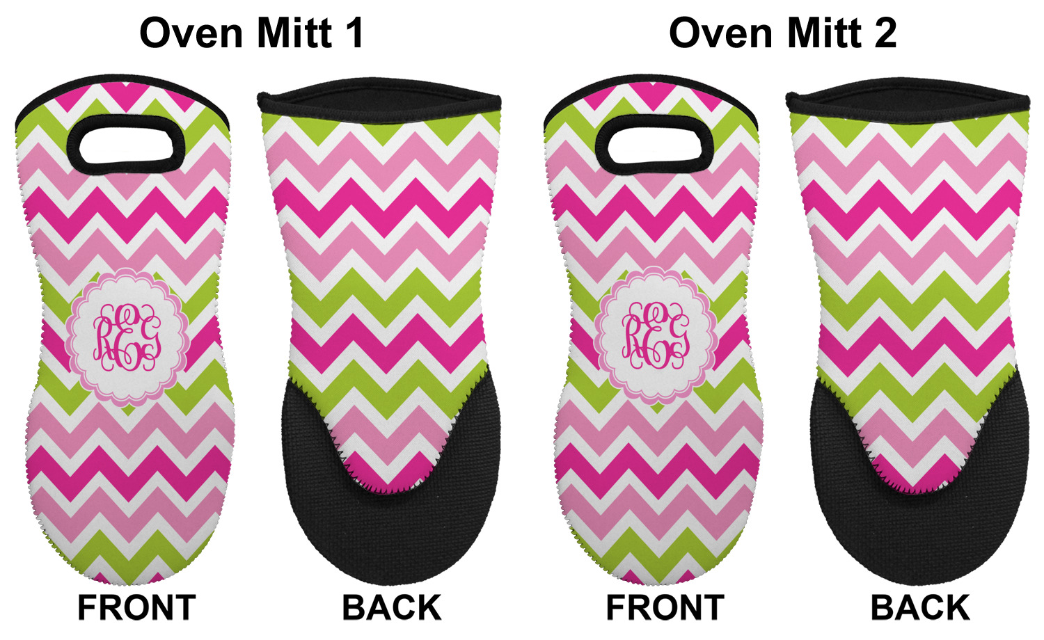 These heat resistant gloves are made entirely of a durable neoprene; the front features a softer texture, while the palm's side has a textured surface, meant to handle heat up to 500 degrees Fahrenheit. Thick, heavy duty stitching connects the two sides. A small, oval cutout appears on the front, and can be used to hang and store the mitt. Your personalization appears on the front, and the upper part of the back of the mitt. The style of these oven mitts are suitable for both the right and left hand, depending on your needs. If you need one for each hand, be sure to order two!