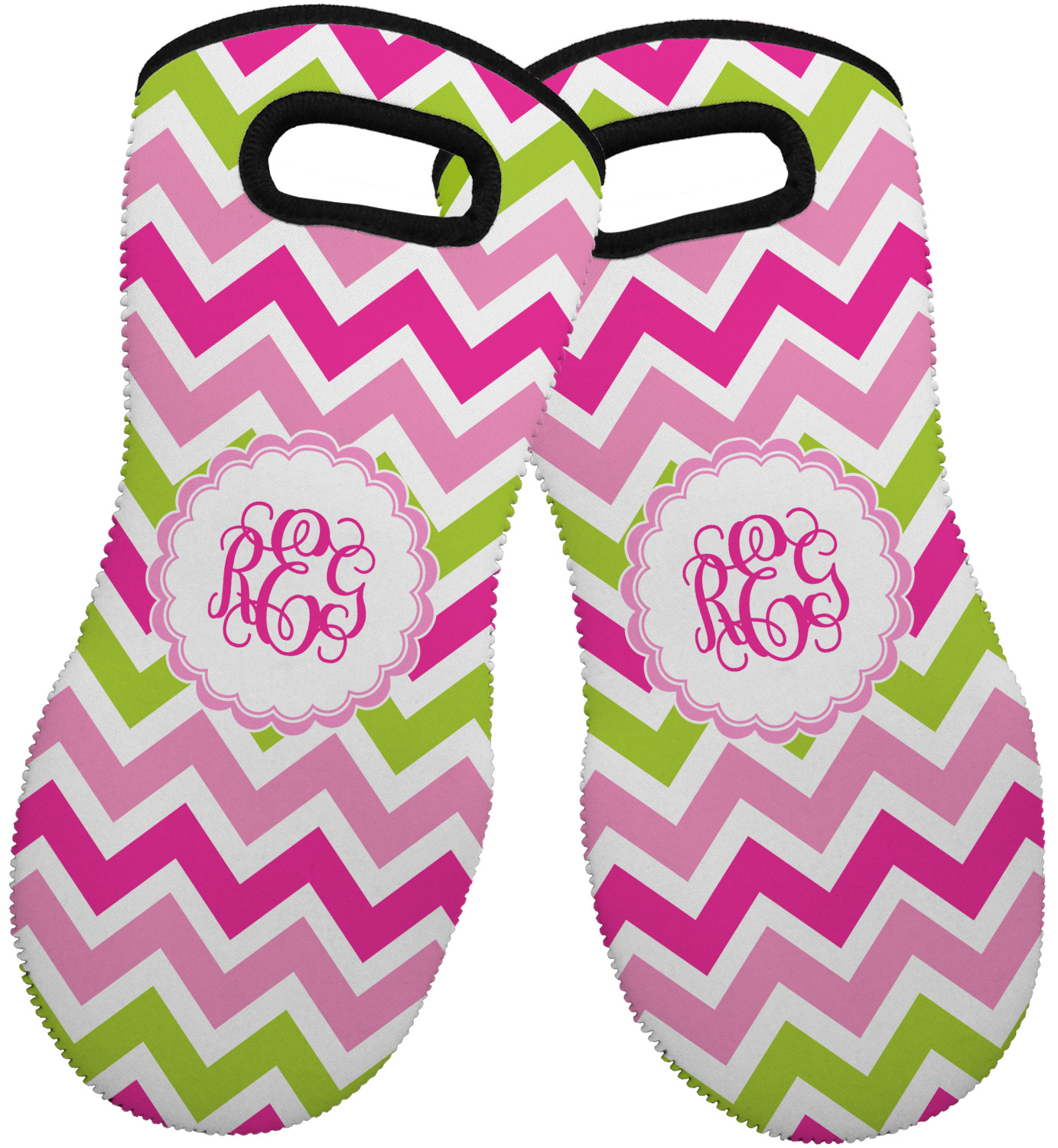 Looking for a girly girl design. This pink and green chevron print with a scalloped label and an interlocking monogram is as girly as it gets. We have created this chevron pattern in lime green, orchid pink and hot pink. For all of us girly girls and princesses, this is our design choice!