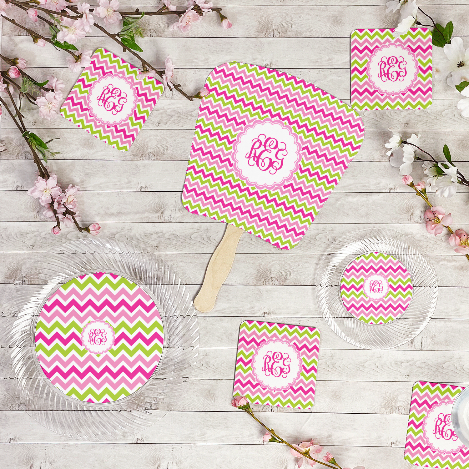 Looking for a girly girl design. This pink and green chevron print with a scalloped label and an interlocking monogram is as girly as it gets. We have created this chevron pattern in lime green, orchid pink and hot pink. For all of us girly girls and princesses, this is our design choice!