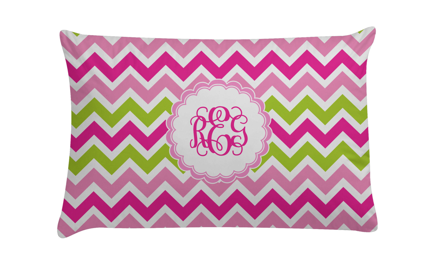 Looking for a girly girl design. This pink and green chevron print with a scalloped label and an interlocking monogram is as girly as it gets. We have created this chevron pattern in lime green, orchid pink and hot pink. For all of us girly girls and princesses, this is our design choice!