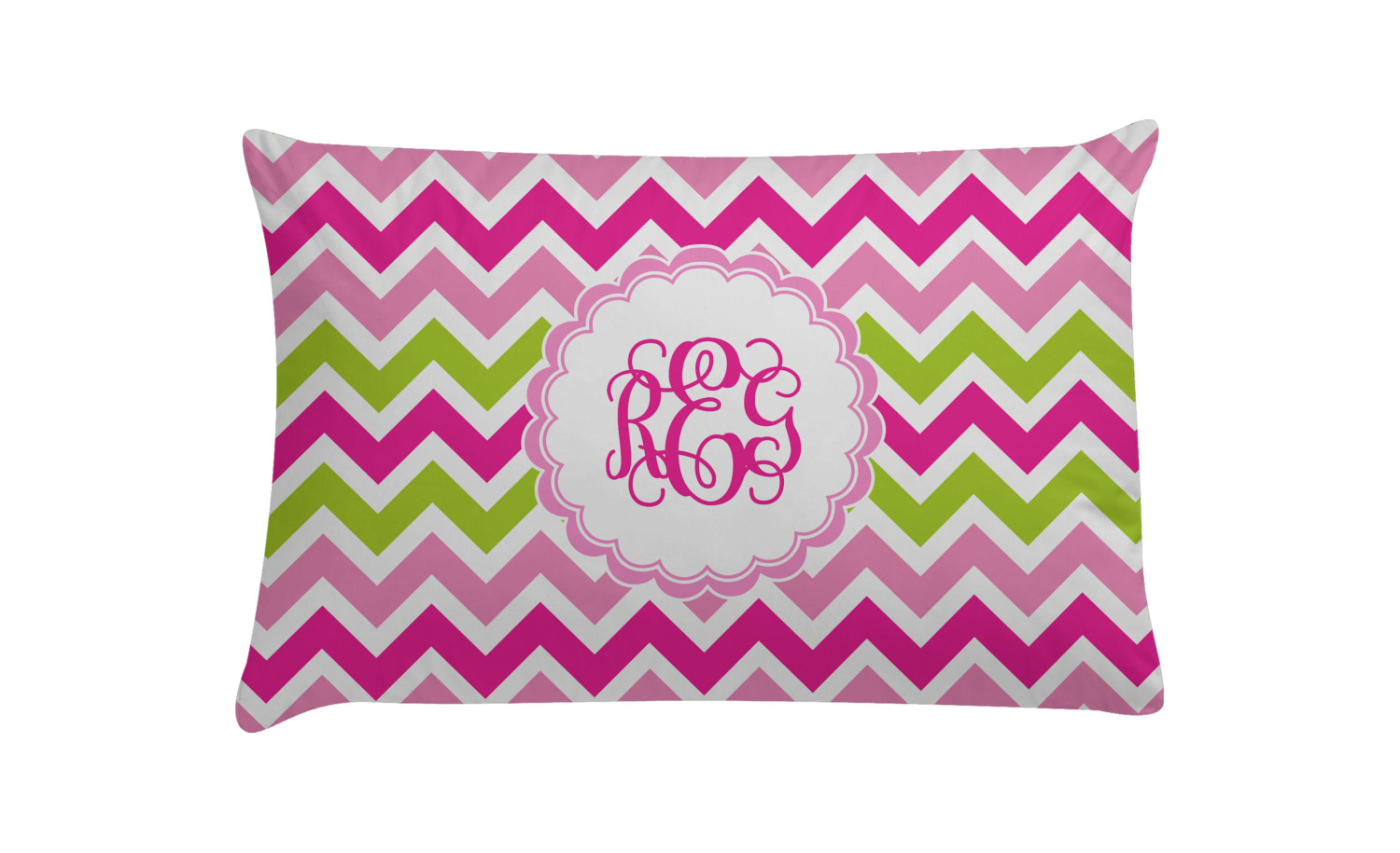 Looking for a girly girl design. This pink and green chevron print with a scalloped label and an interlocking monogram is as girly as it gets. We have created this chevron pattern in lime green, orchid pink and hot pink. For all of us girly girls and princesses, this is our design choice!