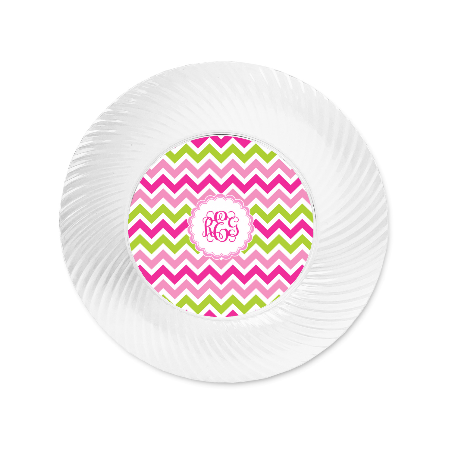 Looking for a girly girl design. This pink and green chevron print with a scalloped label and an interlocking monogram is as girly as it gets. We have created this chevron pattern in lime green, orchid pink and hot pink. For all of us girly girls and princesses, this is our design choice!
