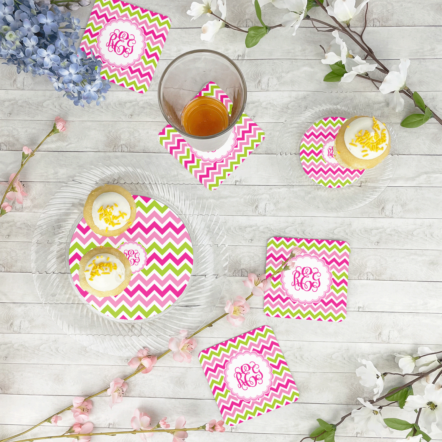 Looking for a girly girl design. This pink and green chevron print with a scalloped label and an interlocking monogram is as girly as it gets. We have created this chevron pattern in lime green, orchid pink and hot pink. For all of us girly girls and princesses, this is our design choice!