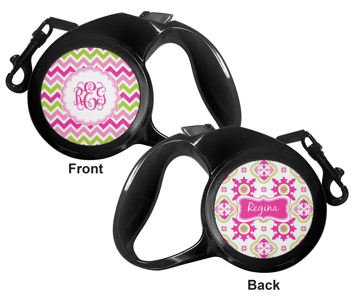 The leash's plastic handle is accommodating of your grip and displays your customization on both sides. The dog leash also features the traditional bolt snap clip, for easy fastening to your dog's collar. The leash and leash handle themselves are both black in color.