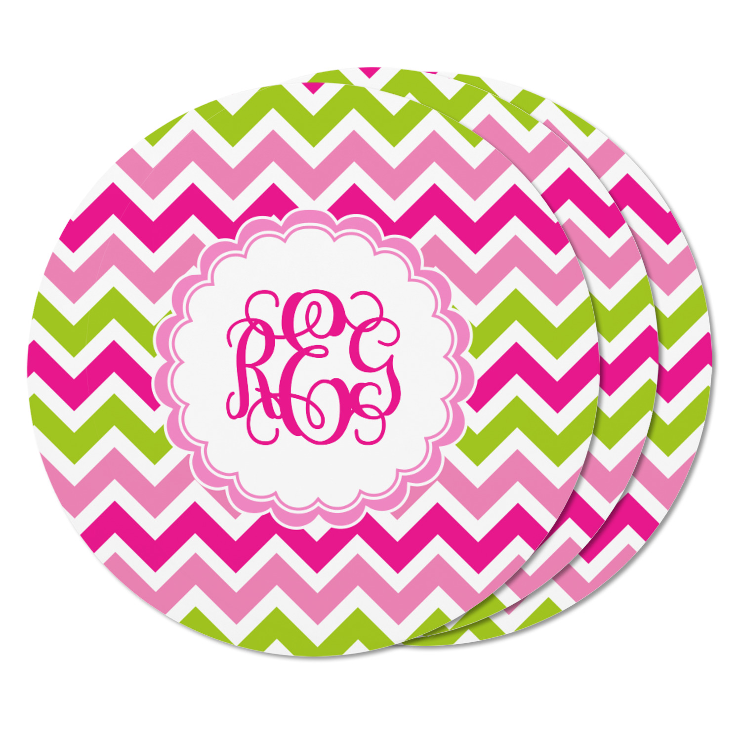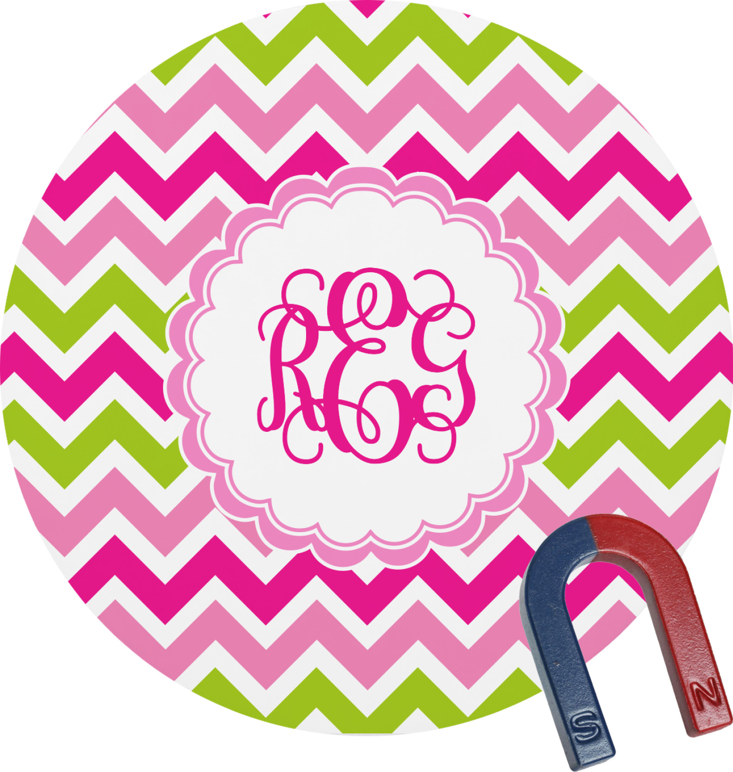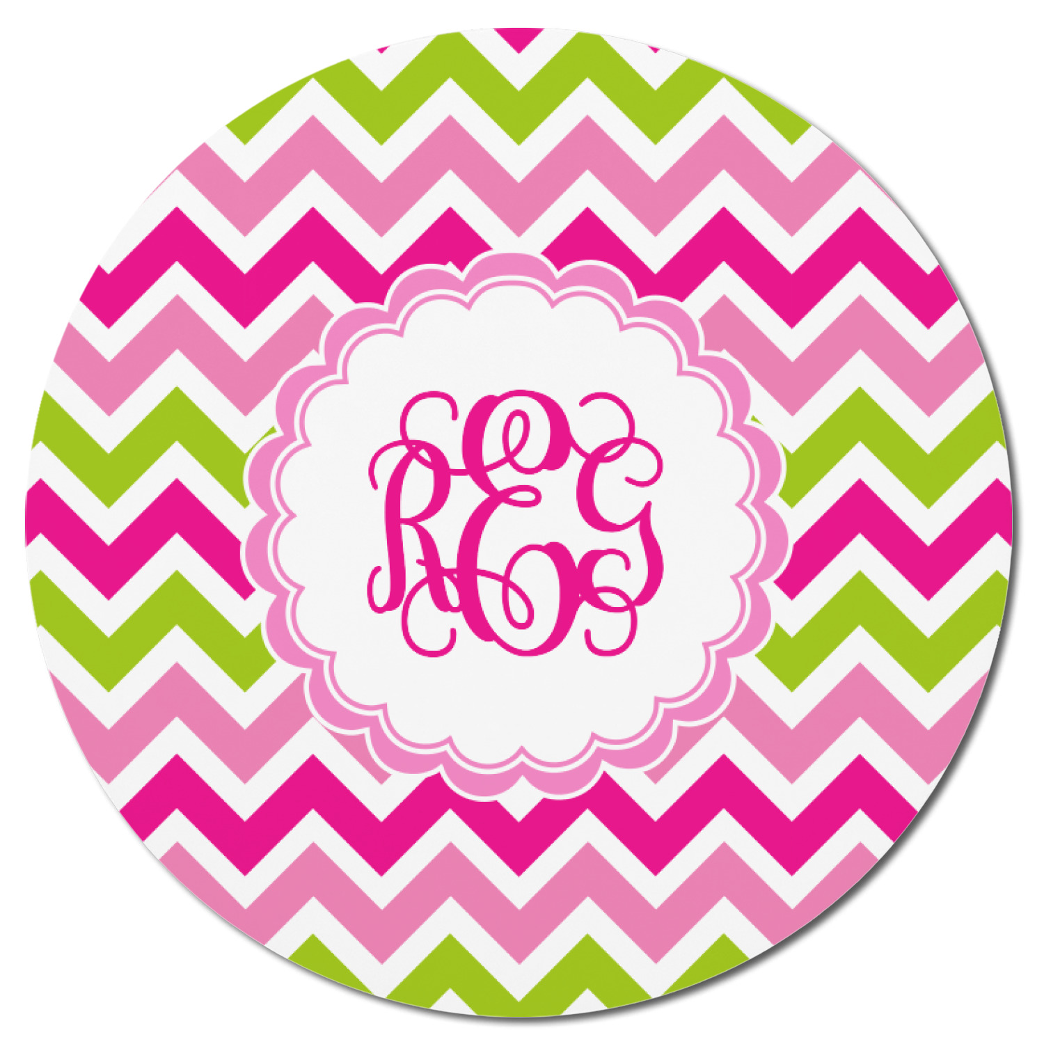 Looking for a girly girl design. This pink and green chevron print with a scalloped label and an interlocking monogram is as girly as it gets. We have created this chevron pattern in lime green, orchid pink and hot pink. For all of us girly girls and princesses, this is our design choice!