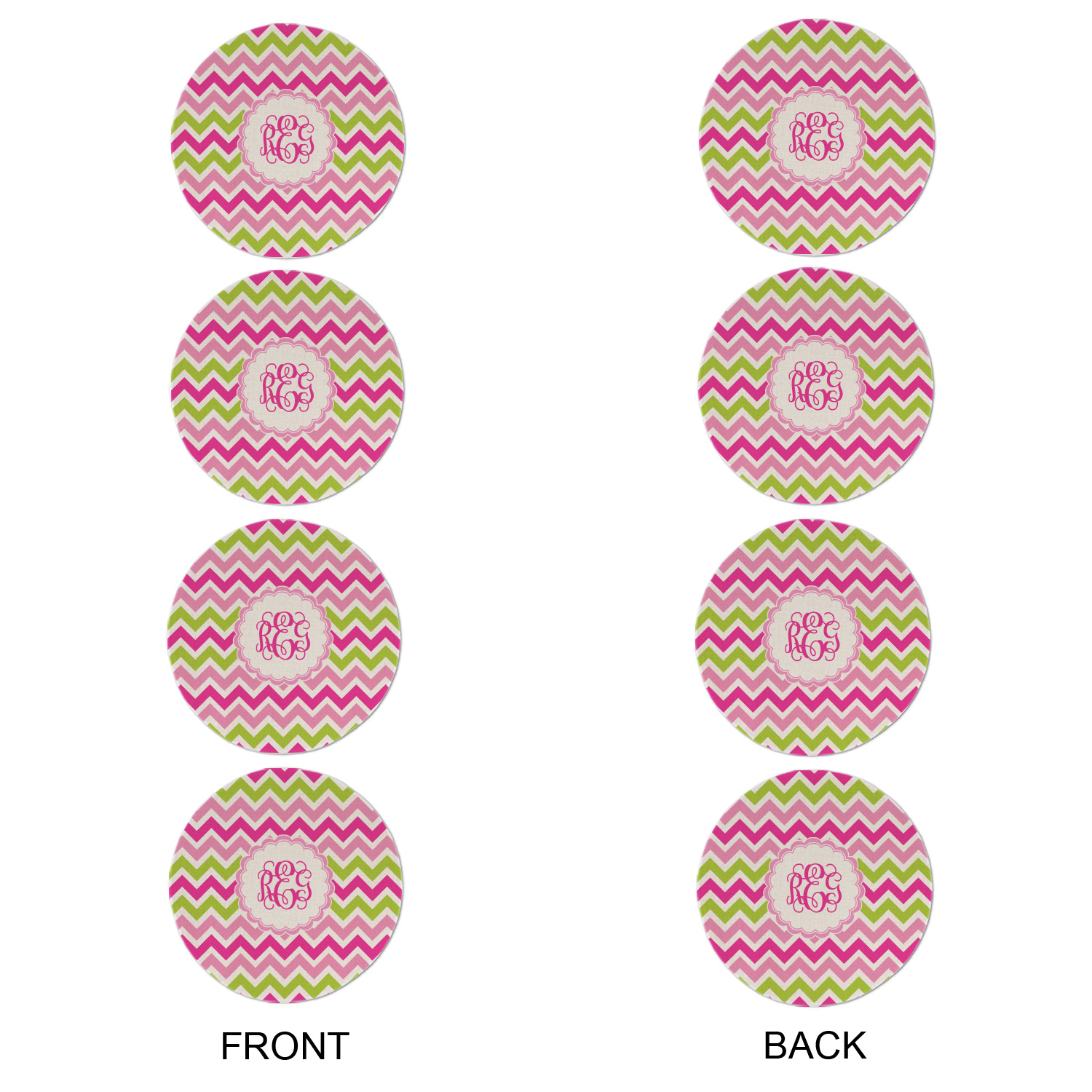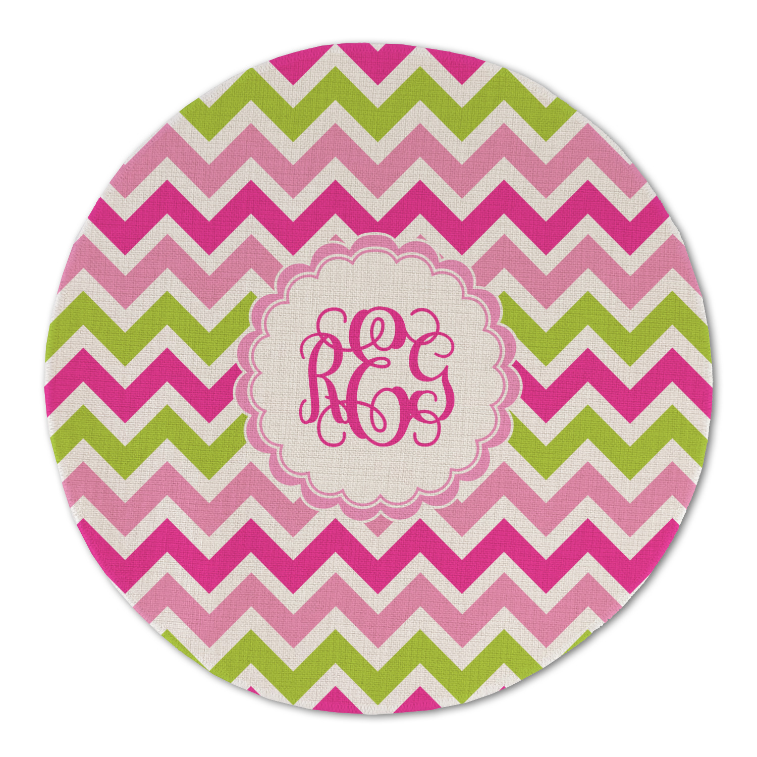 Looking for a girly girl design. This pink and green chevron print with a scalloped label and an interlocking monogram is as girly as it gets. We have created this chevron pattern in lime green, orchid pink and hot pink. For all of us girly girls and princesses, this is our design choice!