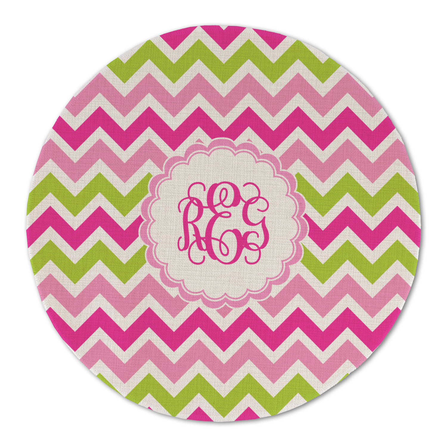 Looking for a girly girl design. This pink and green chevron print with a scalloped label and an interlocking monogram is as girly as it gets. We have created this chevron pattern in lime green, orchid pink and hot pink. For all of us girly girls and princesses, this is our design choice!