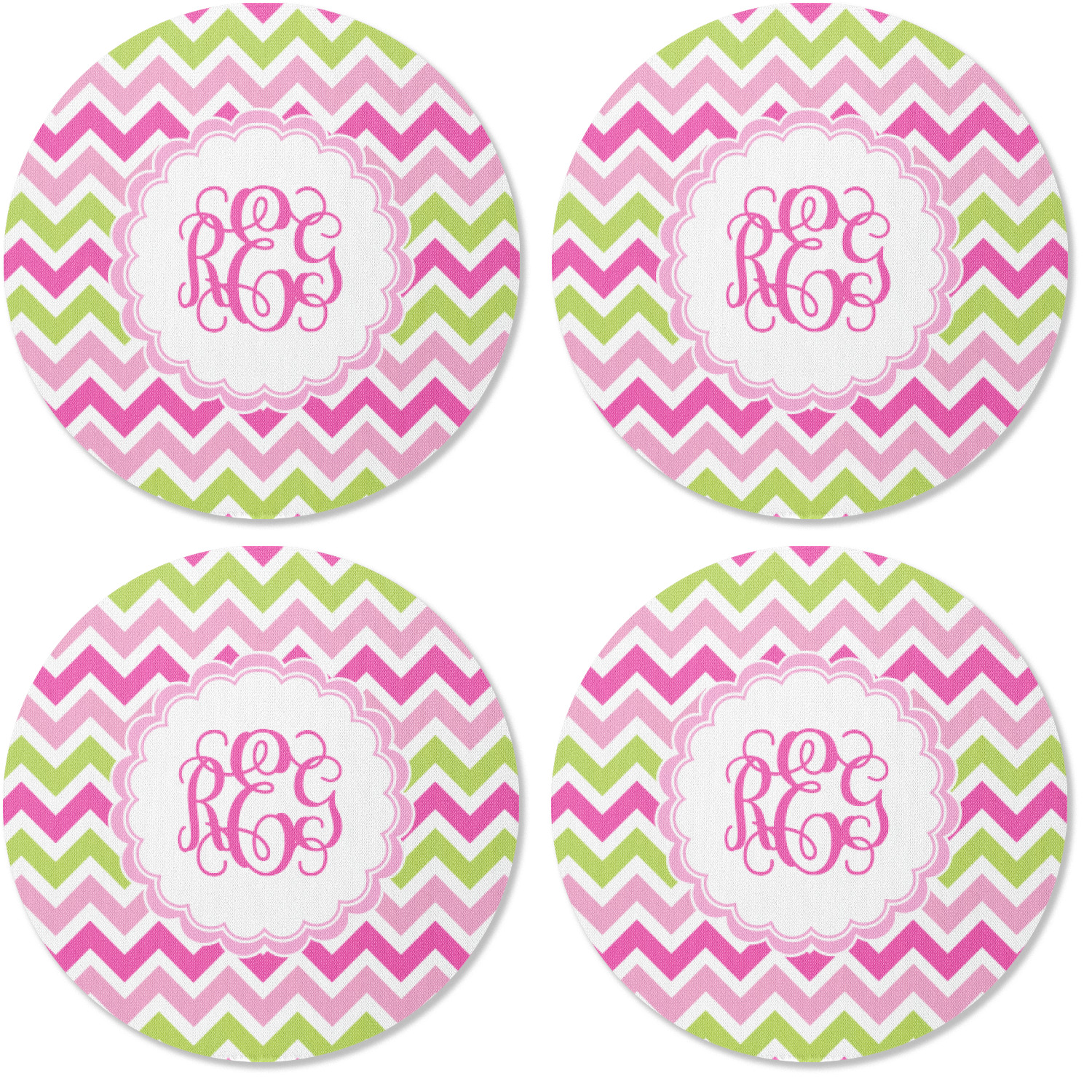 Looking for a girly girl design. This pink and green chevron print with a scalloped label and an interlocking monogram is as girly as it gets. We have created this chevron pattern in lime green, orchid pink and hot pink. For all of us girly girls and princesses, this is our design choice!
