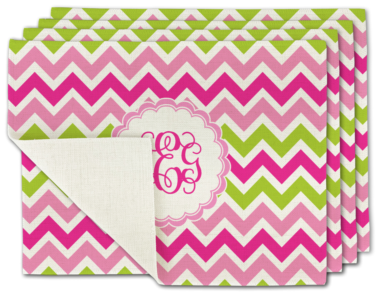 Looking for a girly girl design. This pink and green chevron print with a scalloped label and an interlocking monogram is as girly as it gets. We have created this chevron pattern in lime green, orchid pink and hot pink. For all of us girly girls and princesses, this is our design choice!