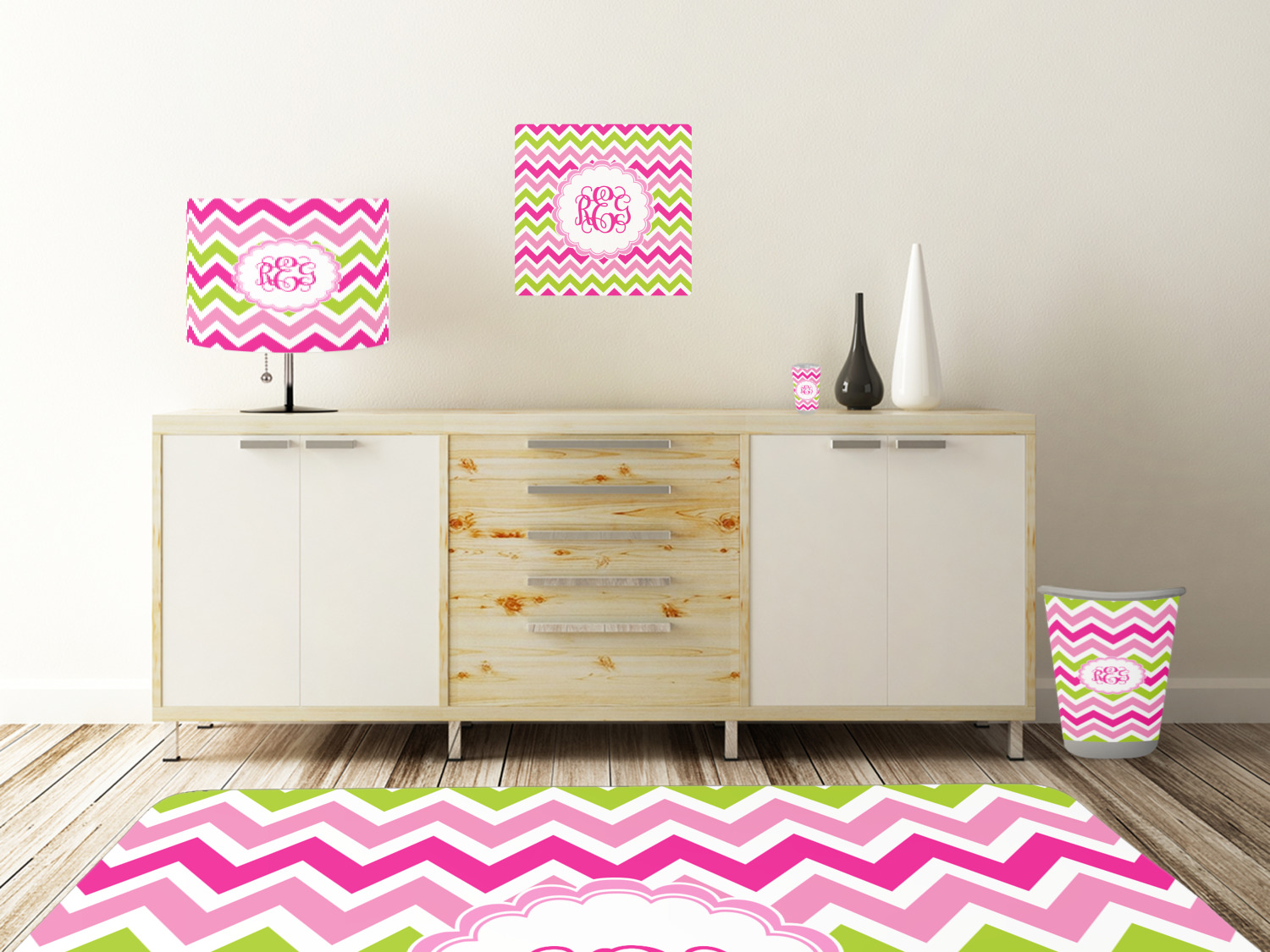 Looking for a girly girl design. This pink and green chevron print with a scalloped label and an interlocking monogram is as girly as it gets. We have created this chevron pattern in lime green, orchid pink and hot pink. For all of us girly girls and princesses, this is our design choice!