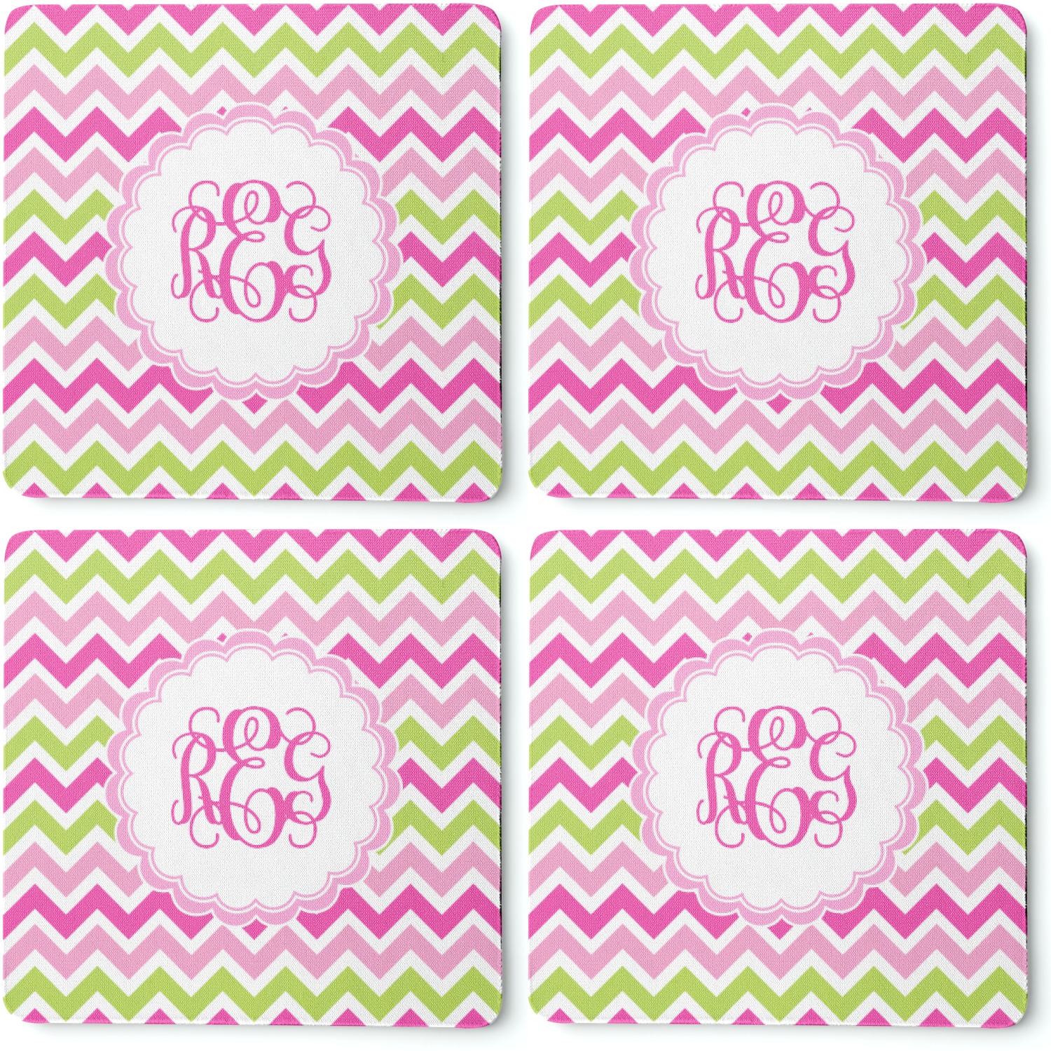 Looking for a girly girl design. This pink and green chevron print with a scalloped label and an interlocking monogram is as girly as it gets. We have created this chevron pattern in lime green, orchid pink and hot pink. For all of us girly girls and princesses, this is our design choice!