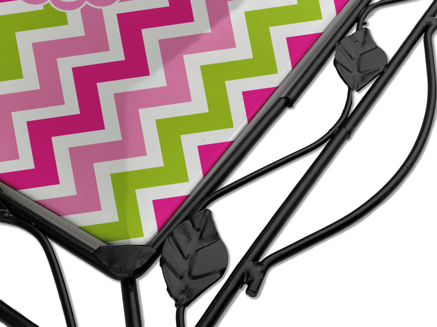 Our square trivets are made from a durable, wrought iron. This model features 4 small half circles, one on each corner, and a larger ring of iron that circles the central, customized tile. Each of the 4 corners has a round foot on its bottom for stability. This trivet is 8.75 by 8.75 inches, but the central tile measures at 6 inches on both sides.
