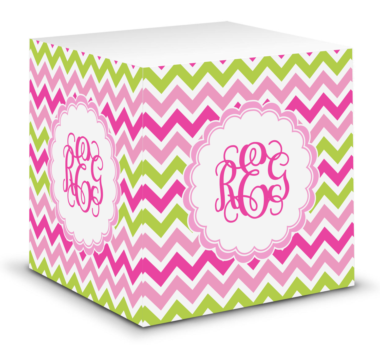 Looking for a girly girl design. This pink and green chevron print with a scalloped label and an interlocking monogram is as girly as it gets. We have created this chevron pattern in lime green, orchid pink and hot pink. For all of us girly girls and princesses, this is our design choice!