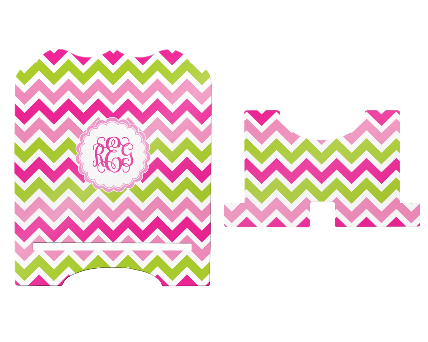 Looking for a girly girl design. This pink and green chevron print with a scalloped label and an interlocking monogram is as girly as it gets. We have created this chevron pattern in lime green, orchid pink and hot pink. For all of us girly girls and princesses, this is our design choice!