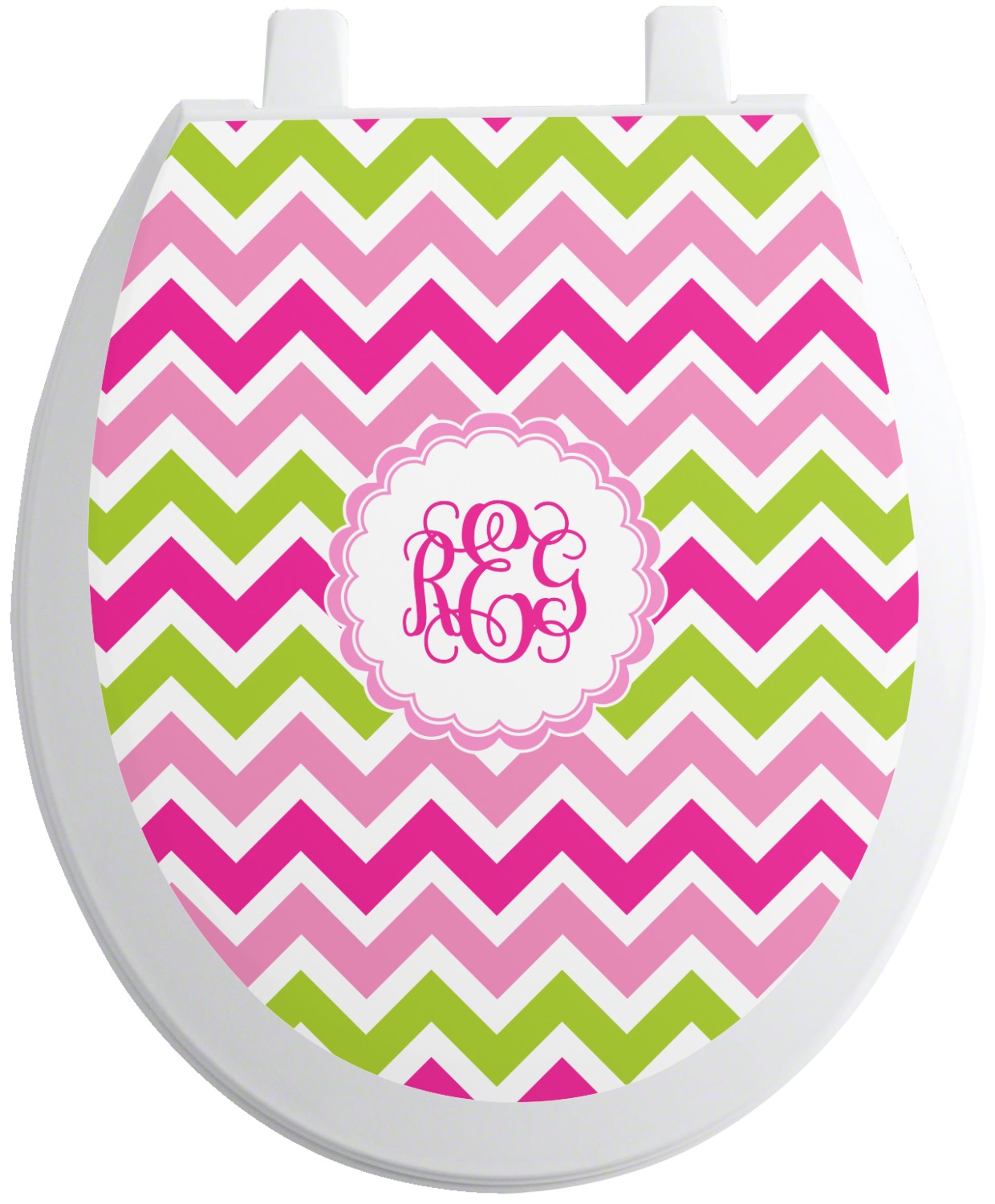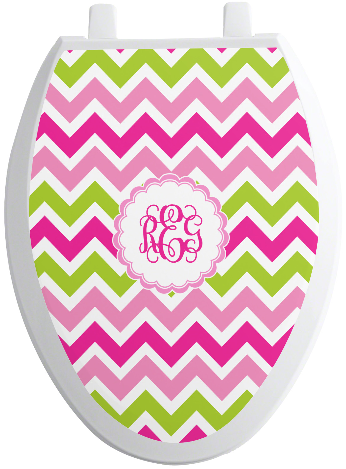 Looking for a girly girl design. This pink and green chevron print with a scalloped label and an interlocking monogram is as girly as it gets. We have created this chevron pattern in lime green, orchid pink and hot pink. For all of us girly girls and princesses, this is our design choice!