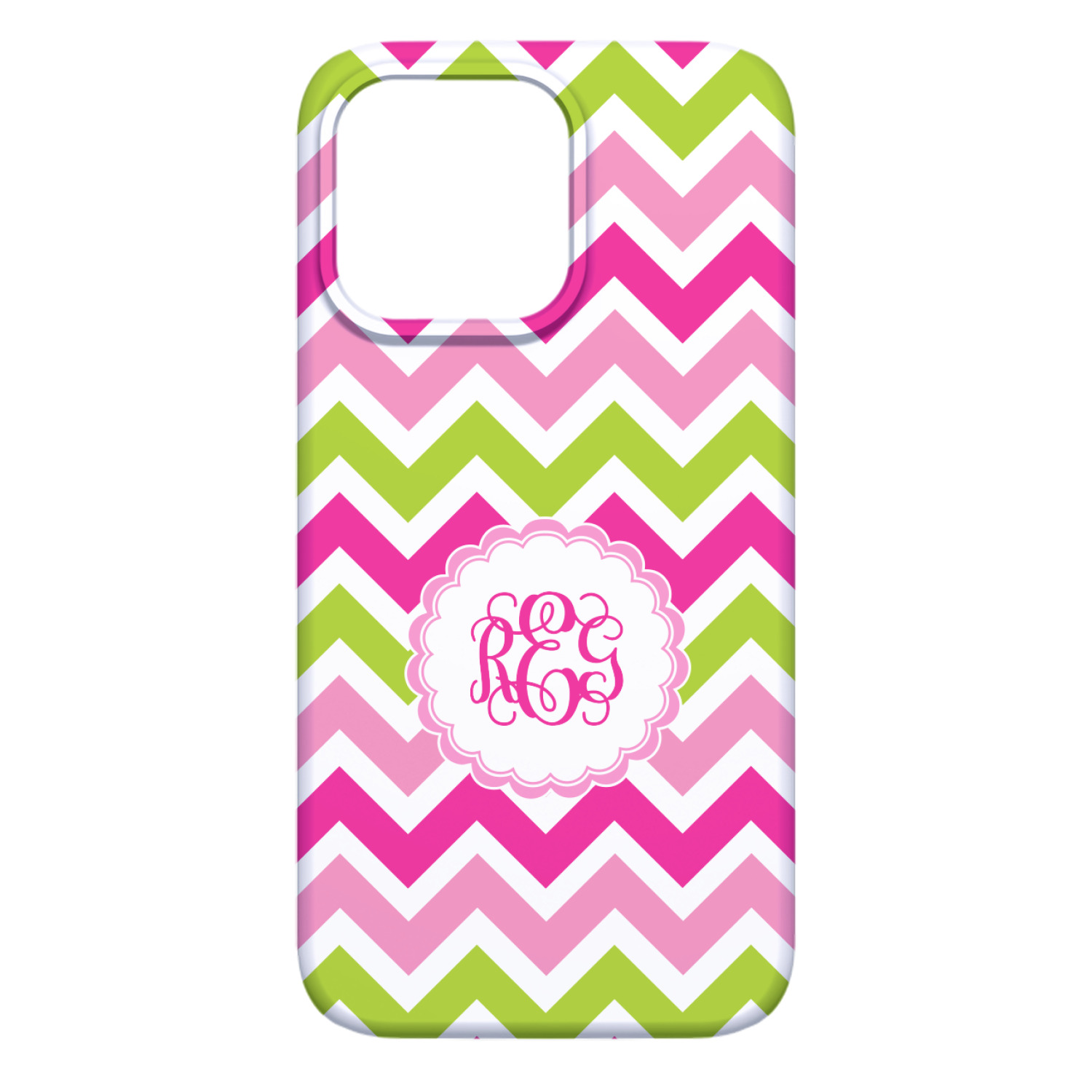 Looking for a girly girl design. This pink and green chevron print with a scalloped label and an interlocking monogram is as girly as it gets. We have created this chevron pattern in lime green, orchid pink and hot pink. For all of us girly girls and princesses, this is our design choice!