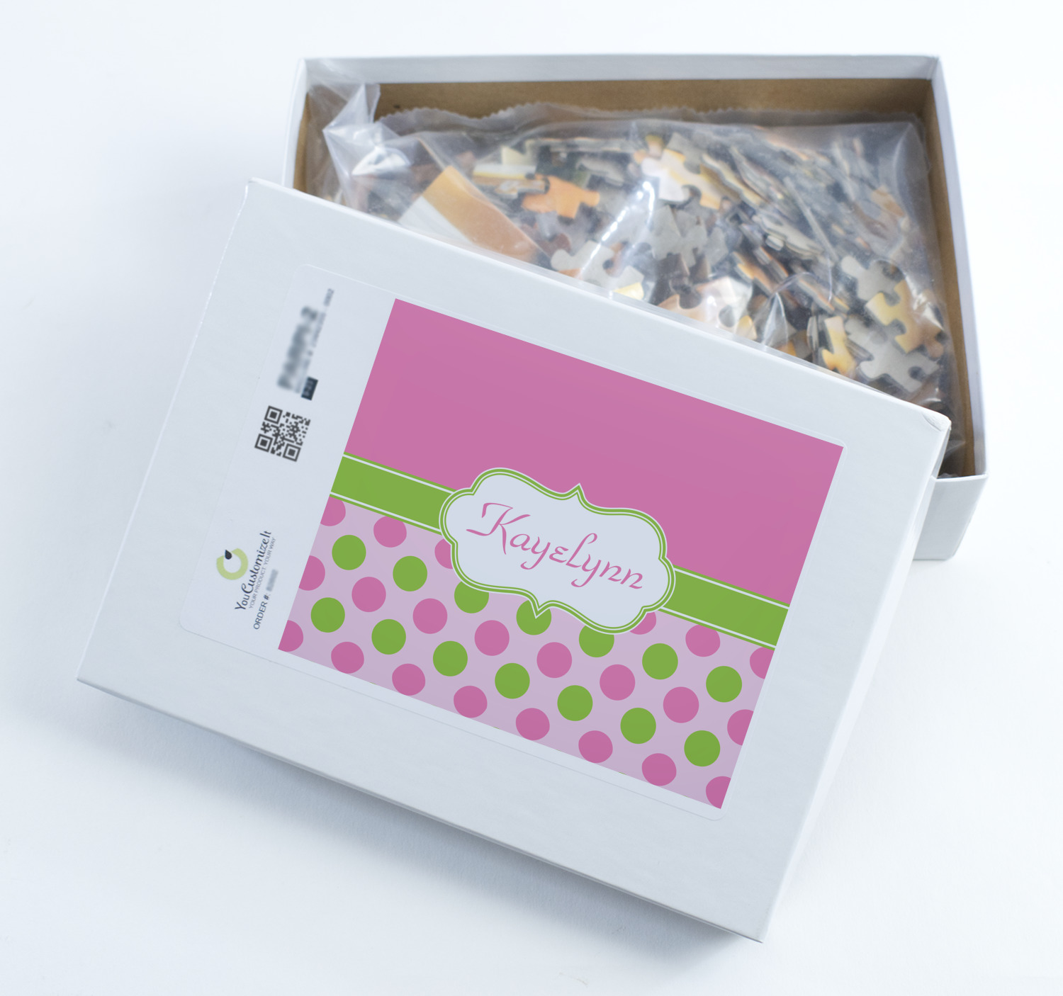 We print our puzzles on thick white chipboard in vibrant colors, then laminate the chipboard and die cut your puzzle. Your jigsaw puzzle is shipped to you in a box with the image of the puzzle on the box.