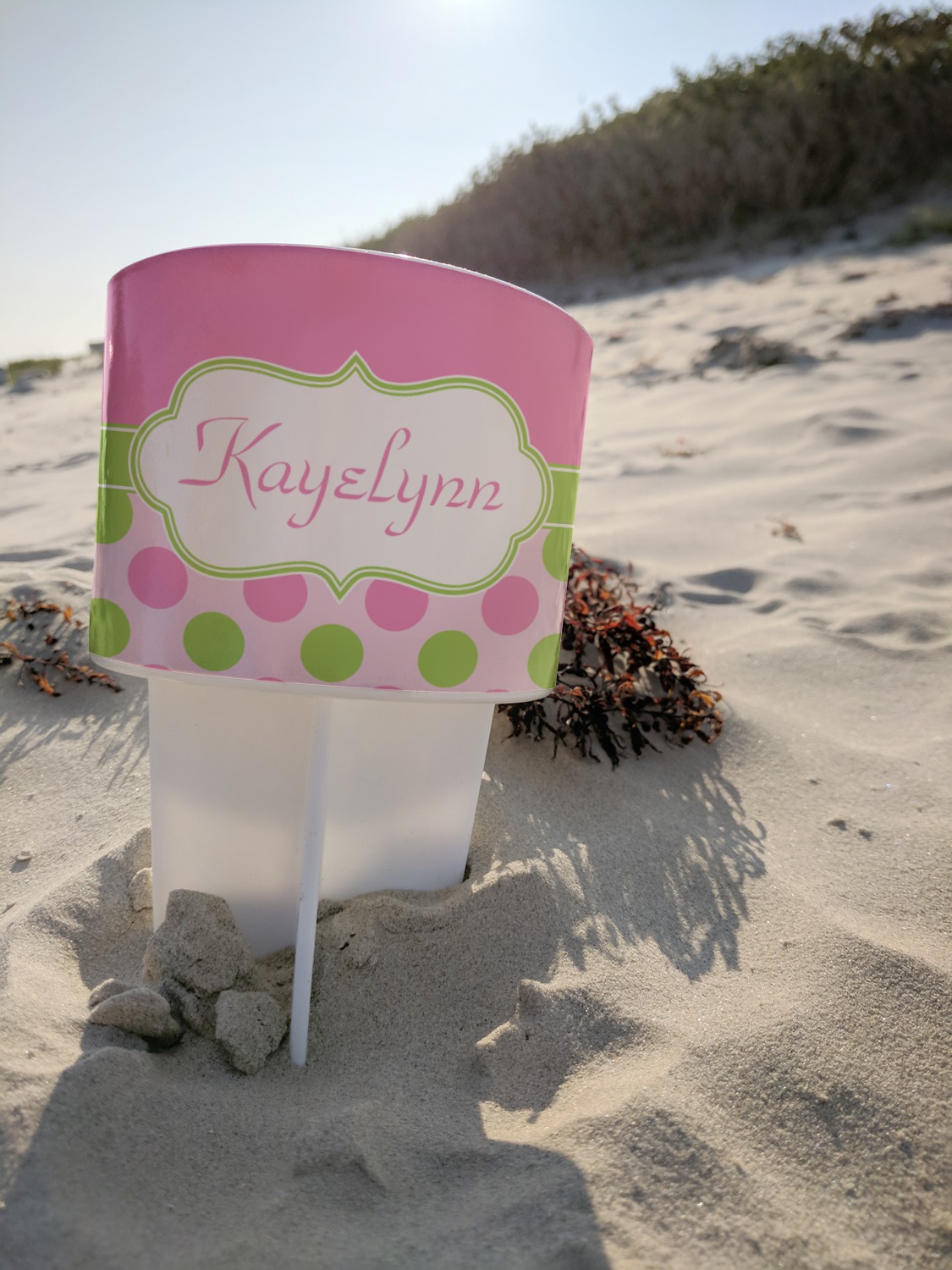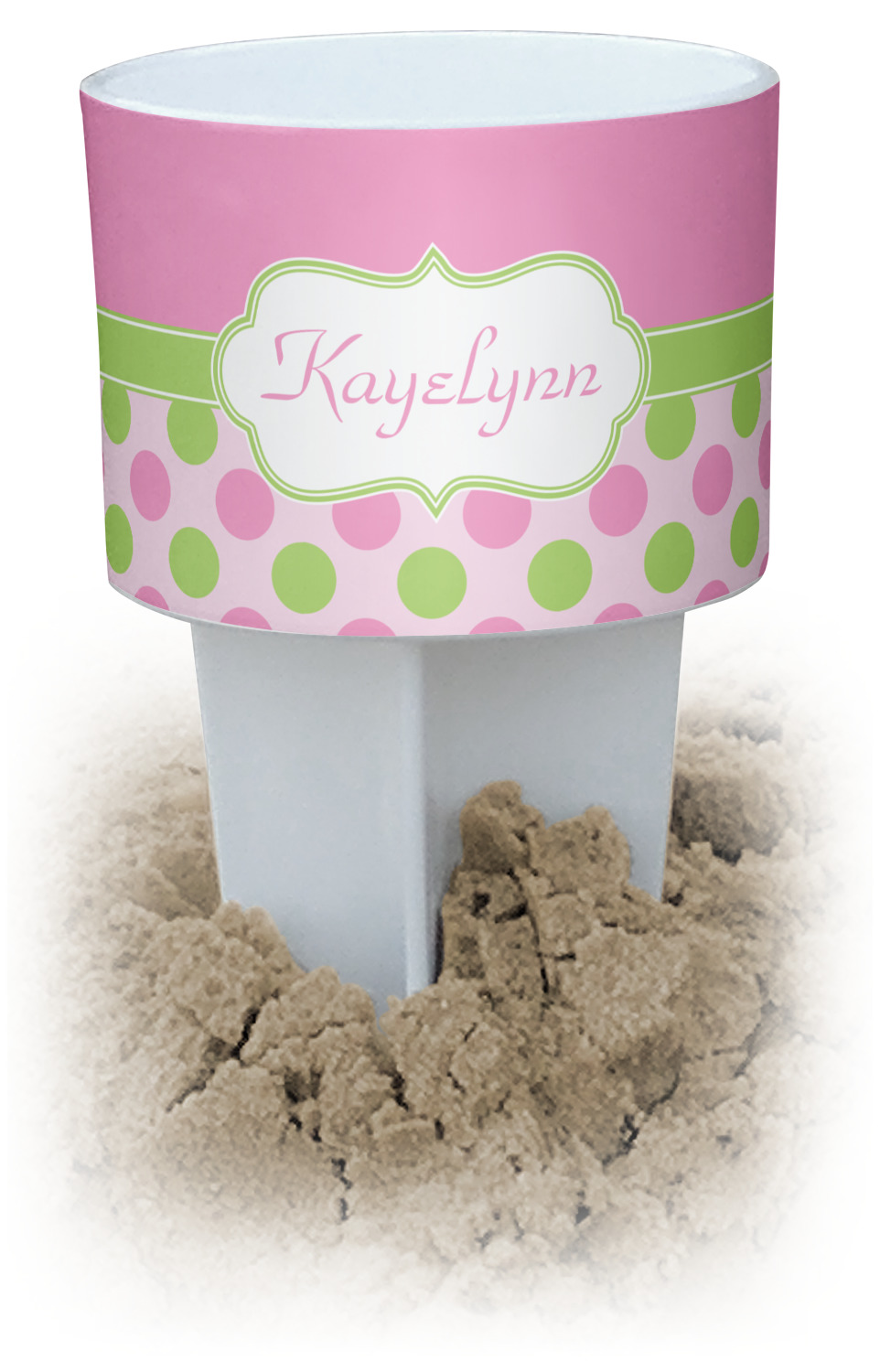 This cup holder has a large stake at its bottom that anchors it to the sand or ground below, while the cup holder rests above the stake. The entire drink holder is made of durable plastic and displays your customization around the cup holder portion. We sell these personalized beach spikers in two different colors: black and white.