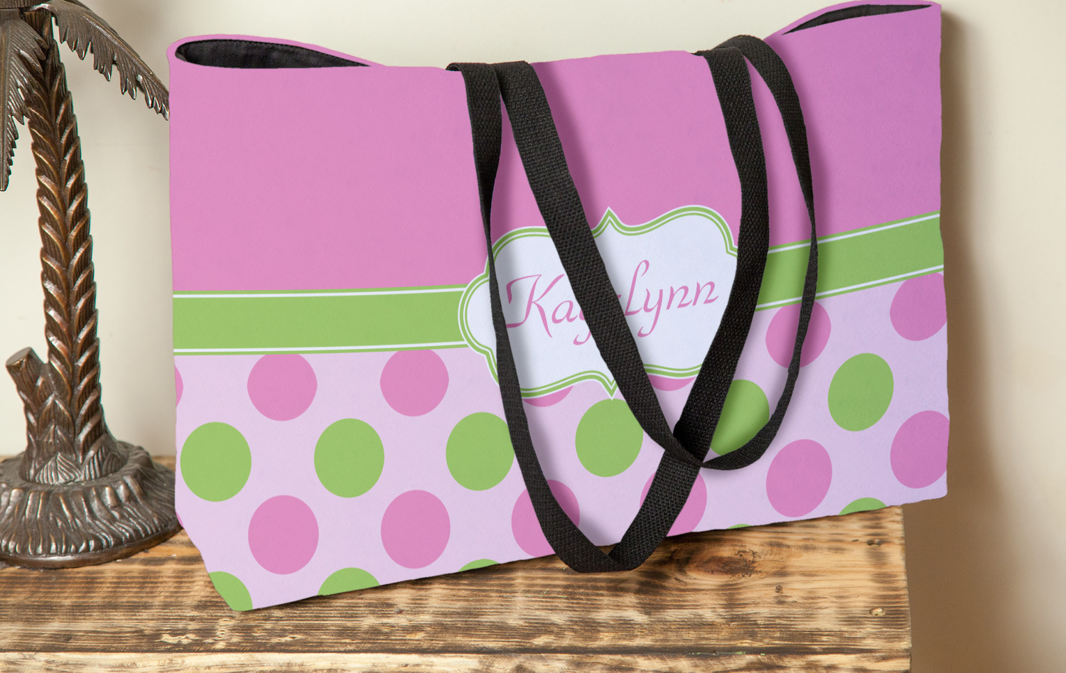 The totes are made from a sturdy canvas material on the outside and are lined with a black poly cotton lining. The beach totes have an approx. 28" black woven handles.