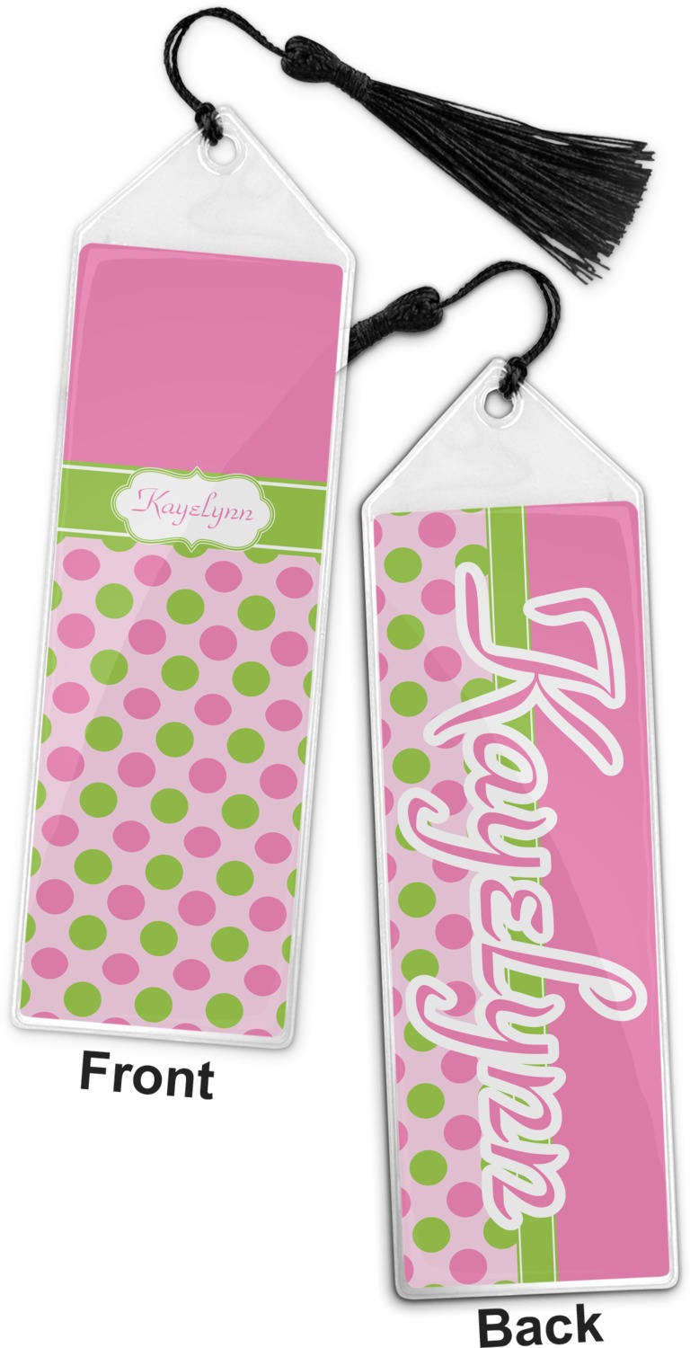 Your personalized bookmark is made of a sturdy, clear vinyl, and is approximately 7.5" x 2.25". We display your personalization on vinyl inserts that are placed on both sides. Accompanying each book marker is a black, fringe tassel that attaches to the reinforced, triangular header.