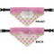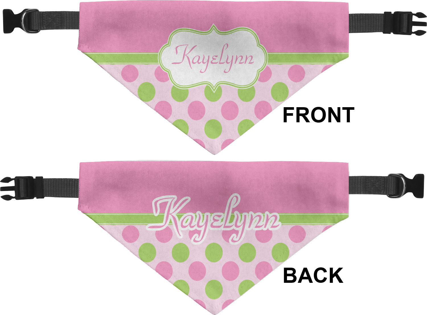 We print the front and back of these dog bandanas with your customized design. The bandana itself is made from a durable polyester, sewn together with a gap large enough to accommodate any collar. Regardless, the bandana includes a plain black, canvas collar with plastic snaps, that can easily be removed if desired. These dog bandana collars are available in four sizes: small, medium, large, and extra large. Please see our sizing chart for more information regarding the dimensions of each size.