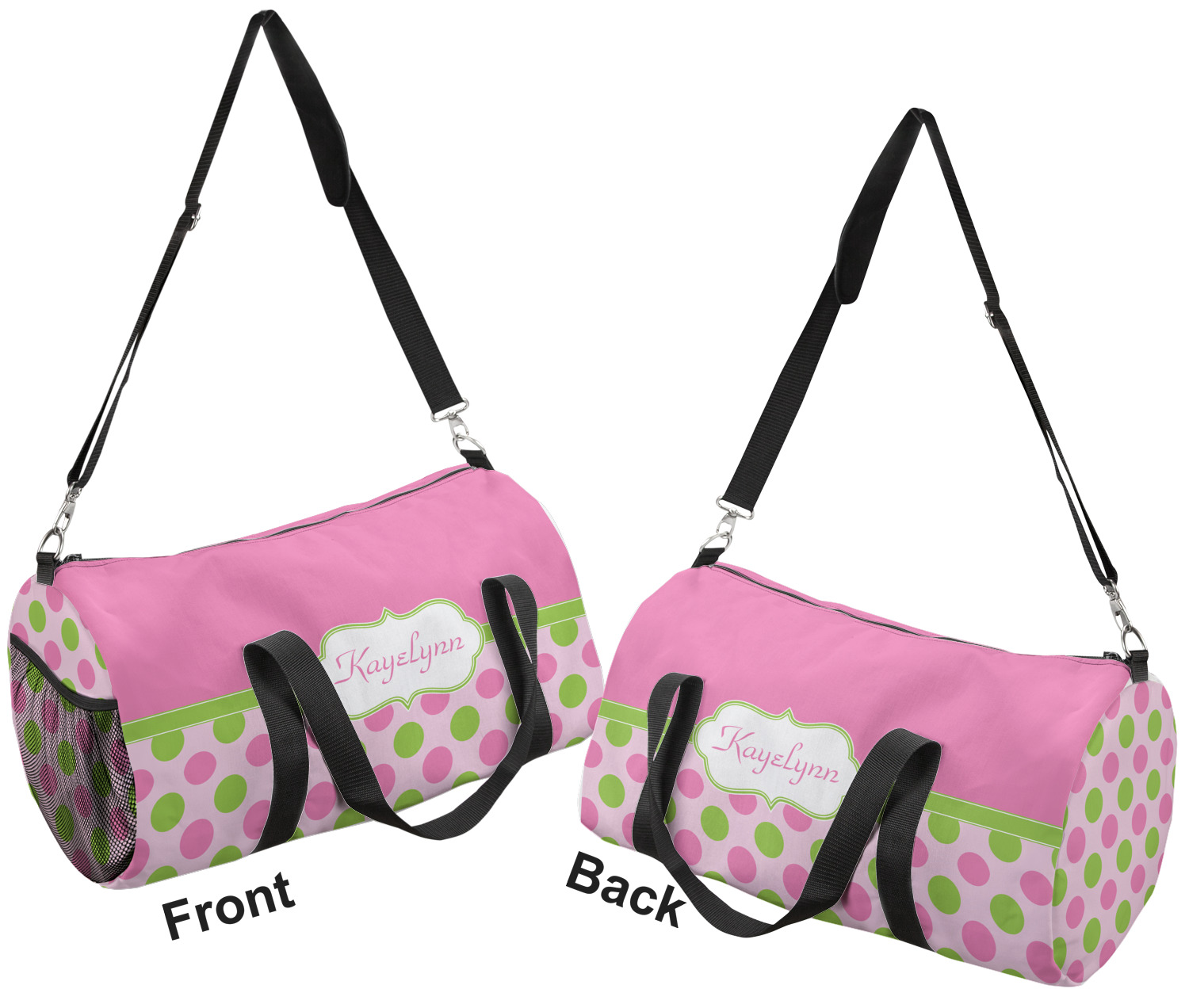 This duffle is a sturdy bag made of a canvas material. It comes in two sizes: Small (19"W x 9.5"H x 9.5"D) and Large (23"W x 12"H x 12"D). The bag is a cylindrical shape with a black adjustable strap and two handles. On one side is an elastic pouch to put a waterbottle or other small item. Your product will be sublimated with your design and is able to be designed on the front, back, and sides. Be sure to remember that the straps may cut into parts of your design if you upload your own artwork.