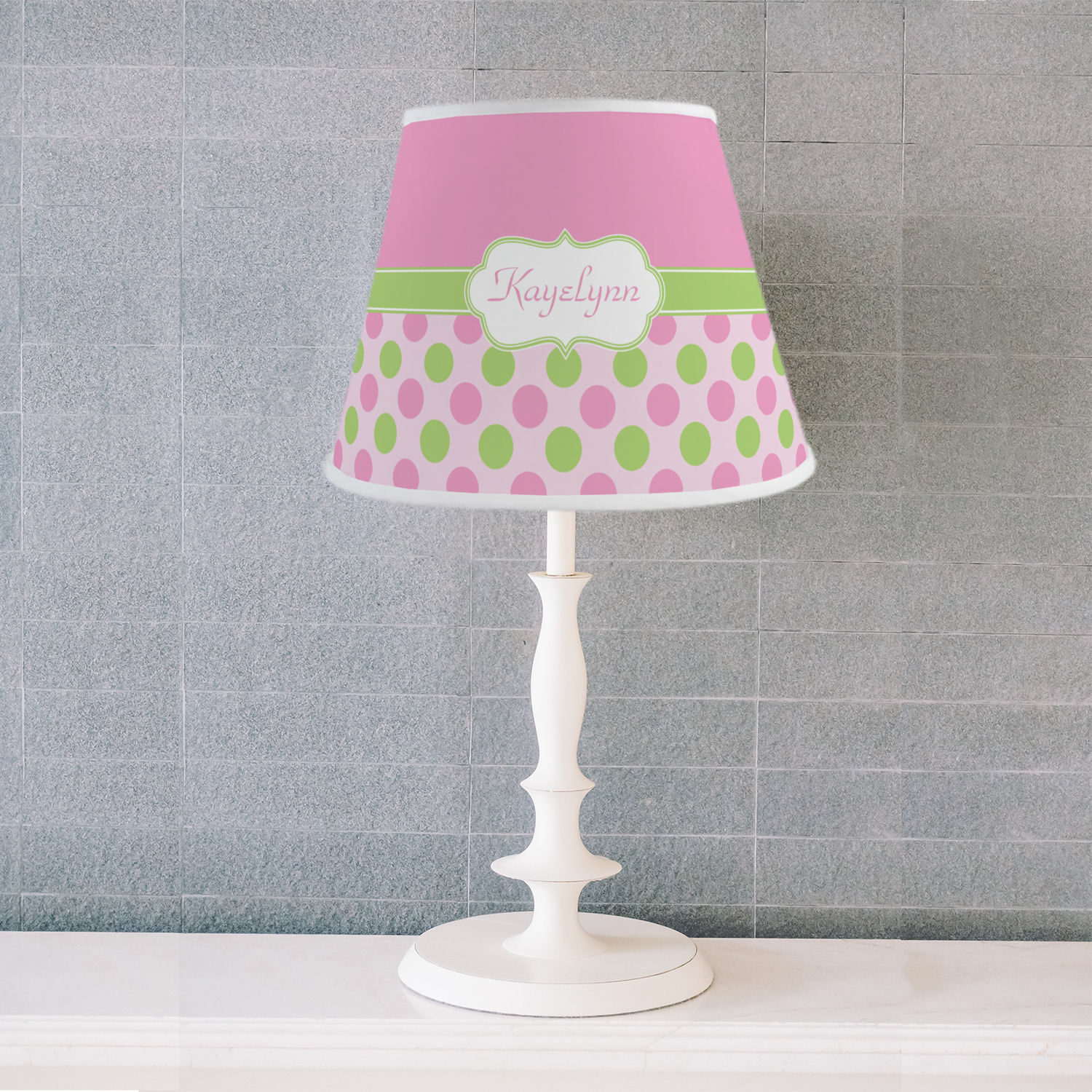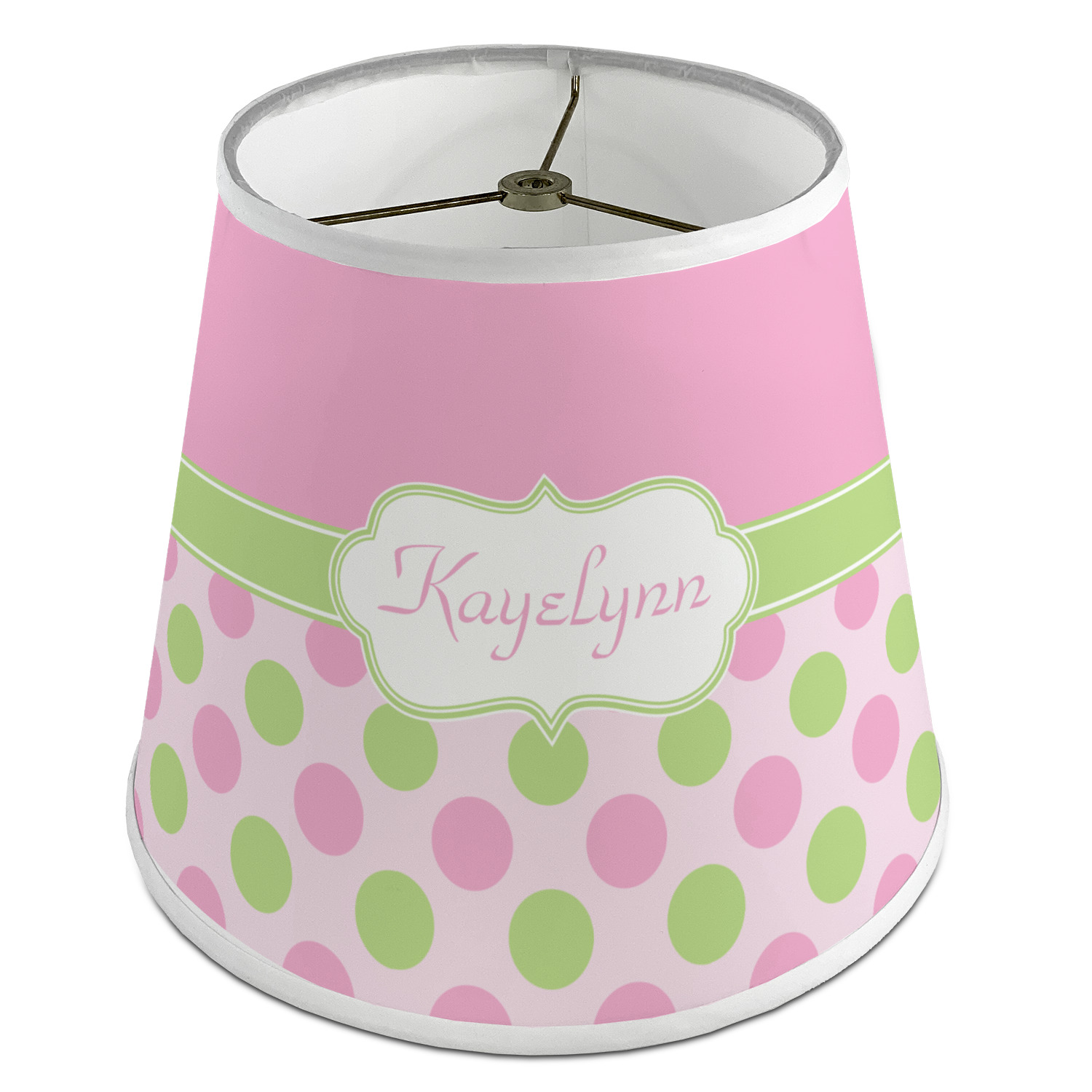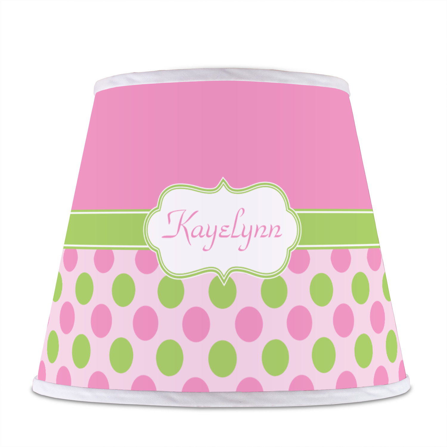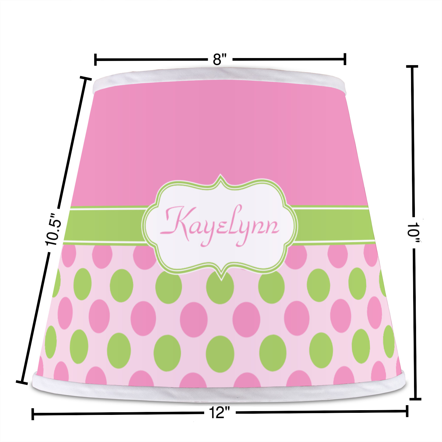 The base of this lampshade is 12 inches in diameter, and the top spans 8 inches in diameter. The total height of the lampshade is 10 inches. The angled nature of this custom lampshade concentrates the light, making it ideal for smaller spaces. This lampshade is made of matte, polyfilm, and displays your customization in its middle. The top and bottom of this colorful lamp shade are lined with a white fabric ribbon (which can be replaced with black inside the design studio) which frames your design and creates a sophisticated finish. As an UNO fitter lampshade, this unique lamp shade will fit a variety of bases.