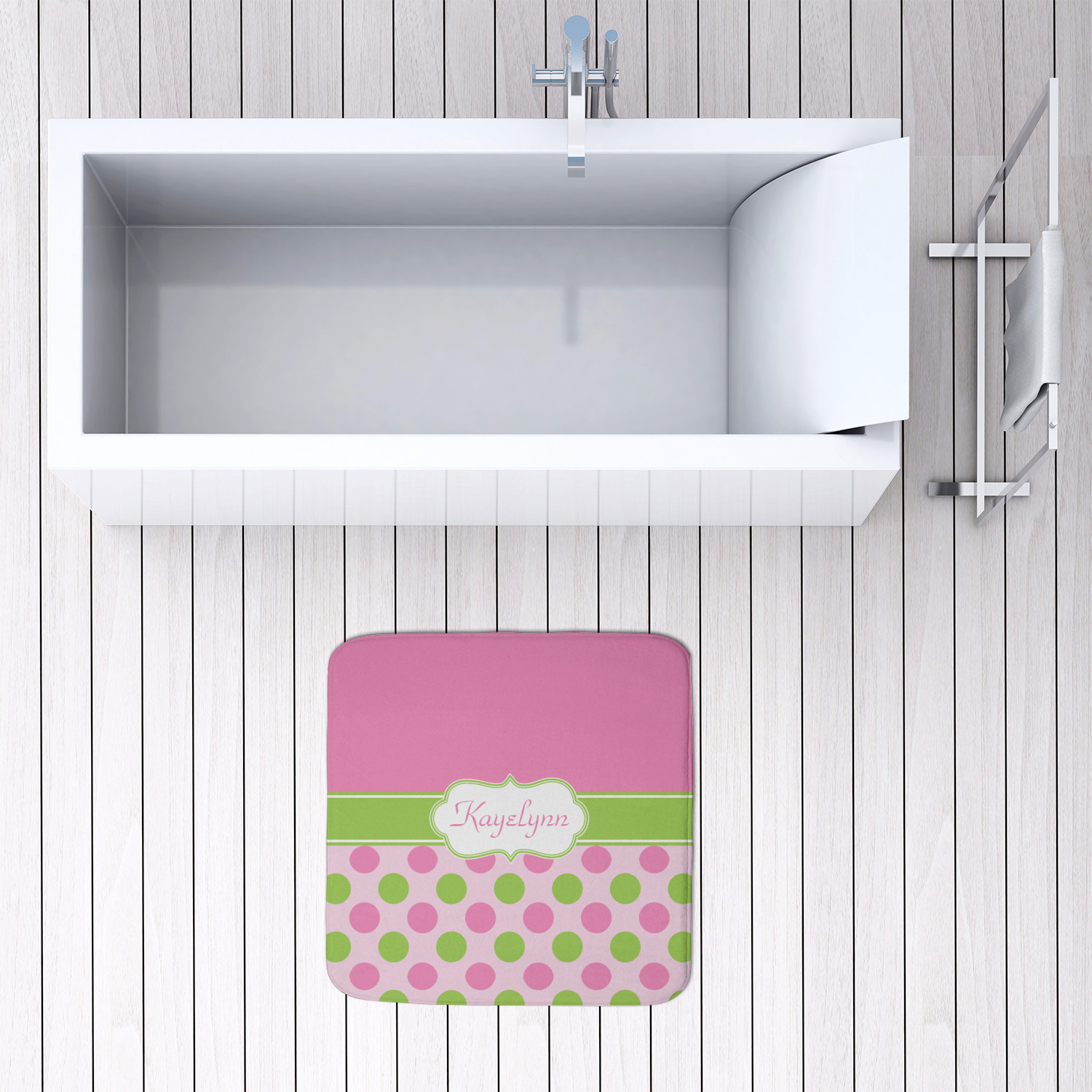 We offer this custom bath mat in four different sizes, so that you can choose the proper size for your bathroom and shower space. We suggest measuring the area before so that you can make an informed purchase. The four sizes are as follows: 24 by 17 inches, 34 by 21 inches, 48 by 36 inches, and 48 by 48 inches.